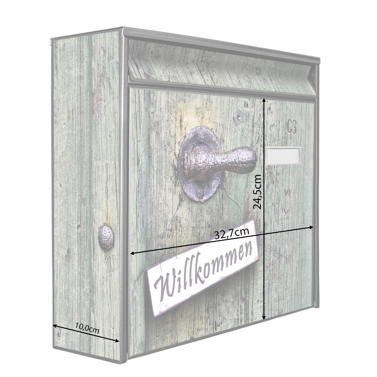 Die Größe des Briefkastens ist 36 x 32 x 10cm (BxHxT) groß. Das Motiv besteht aus einer wetter- und UV-festen Folie, die mit einem Schutzlaminat überzogen ist und Ihren Briefkasten zusätzlich vor Kratzern schützt. Sie erhalten 2 Schlüssel sowie das Montagematerial.