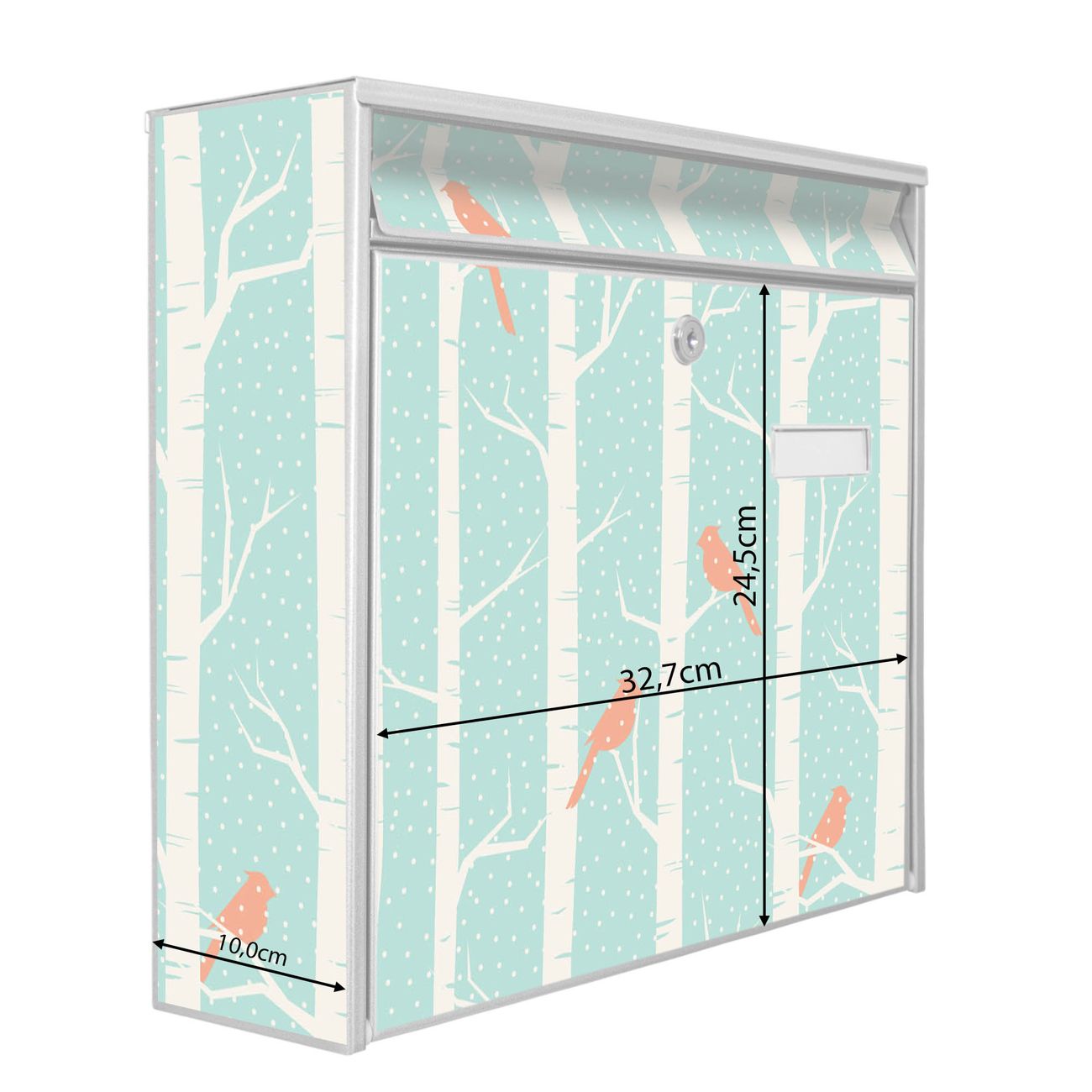 Die Größe des Briefkastens ist 36 x 32 x 10cm (BxHxT) groß. Das Motiv besteht aus einer wetter- und UV-festen Folie, die mit einem Schutzlaminat überzogen ist und Ihren Briefkasten zusätzlich vor Kratzern schützt. Sie erhalten 2 Schlüssel sowie das Montagematerial.