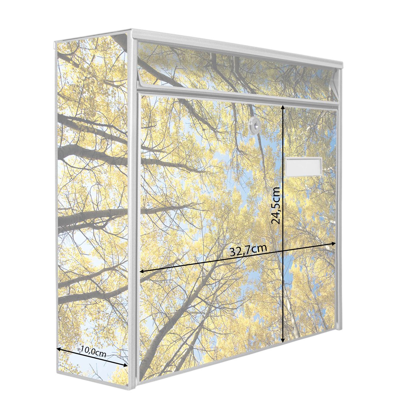 Die Größe des Briefkastens ist 36 x 32 x 10cm (BxHxT) groß. Das Motiv besteht aus einer wetter- und UV-festen Folie, die mit einem Schutzlaminat überzogen ist und Ihren Briefkasten zusätzlich vor Kratzern schützt. Sie erhalten 2 Schlüssel sowie das Montagematerial.