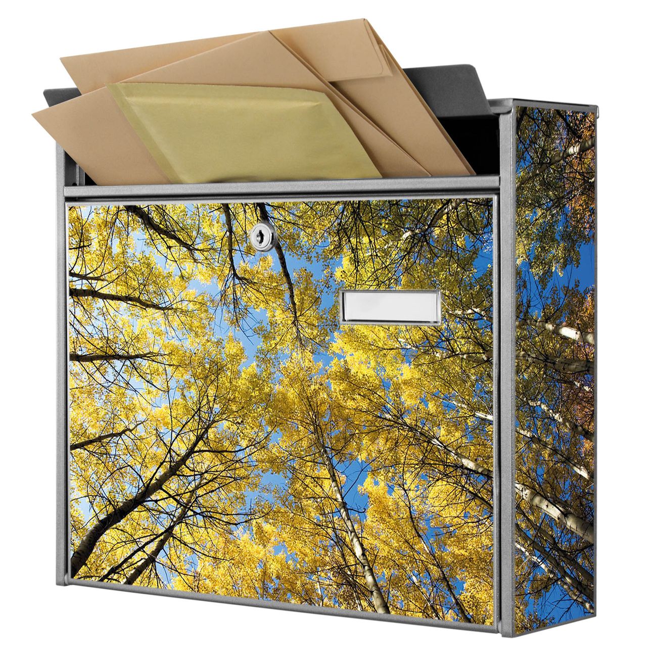 Der Burg Wächter Mail Briefkasten mit Motiv Wipfel bietet Ihnen mit seinem Fassungsvermögen genügend Platz auch für große A4 Sendungen. Auf Wunsch können Sie bei uns den passenden Standfuß kaufen und so aus dem Wandbriefkasten einen Standbriefkasten machen. Wir bieten Ihnen ebenfalls Namensschilder, bereits beschriftet oder frei zu beschriften, und verschiedene selbst gestaltete Bitte-Keine-Werbung-Aufkleber.