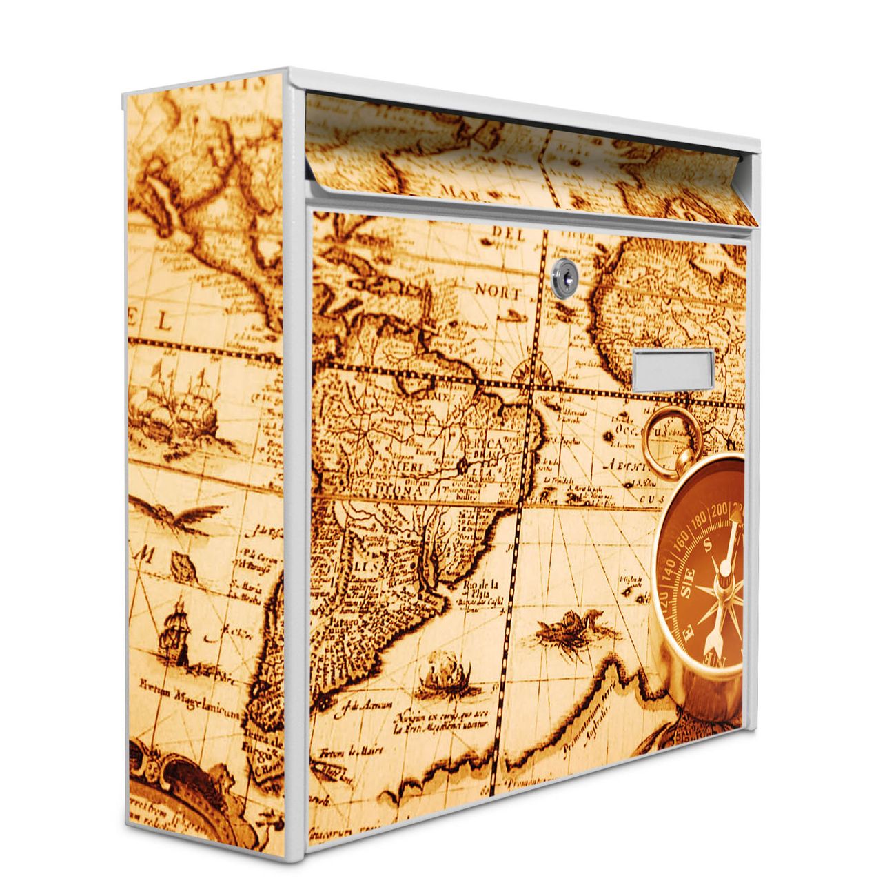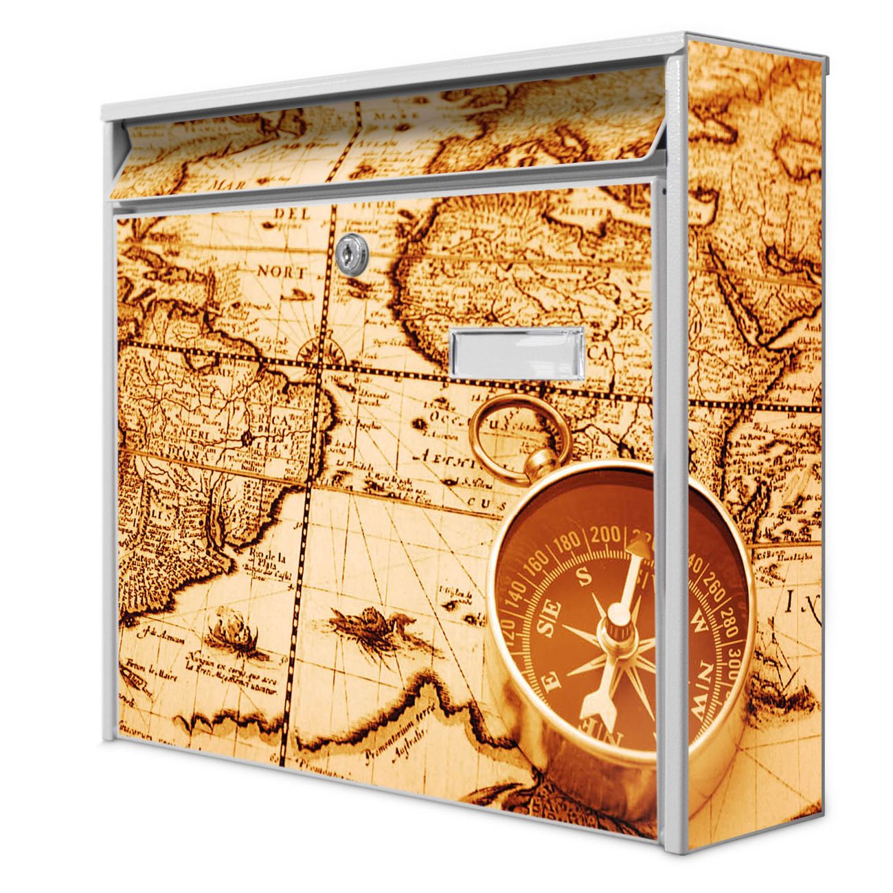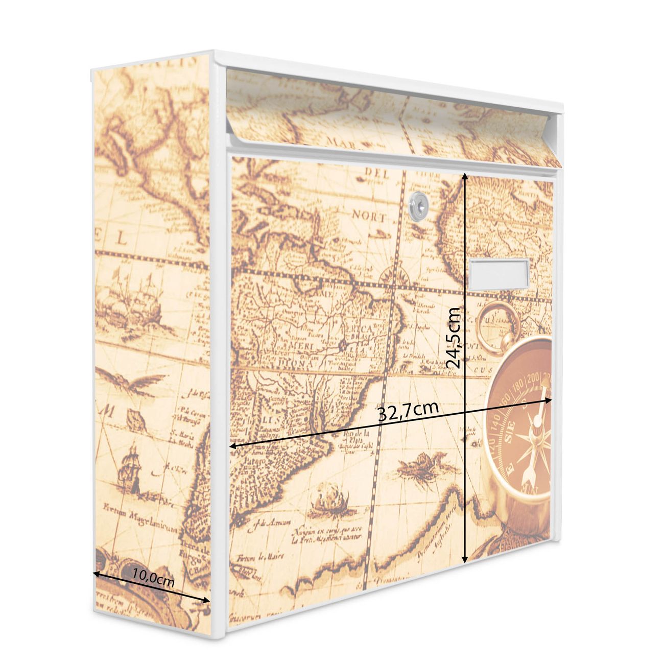 Der Burg Wächter Mail Briefkasten mit Motiv World Map bietet Ihnen mit seinem Fassungsvermögen genügend Platz auch für große A4 Sendungen. Auf Wunsch können Sie bei uns den passenden Standfuß kaufen und so aus dem Wandbriefkasten einen Standbriefkasten machen. Wir bieten Ihnen ebenfalls Namensschilder, bereits beschriftet oder frei zu beschriften, und verschiedene selbst gestaltete Bitte-Keine-Werbung-Aufkleber.