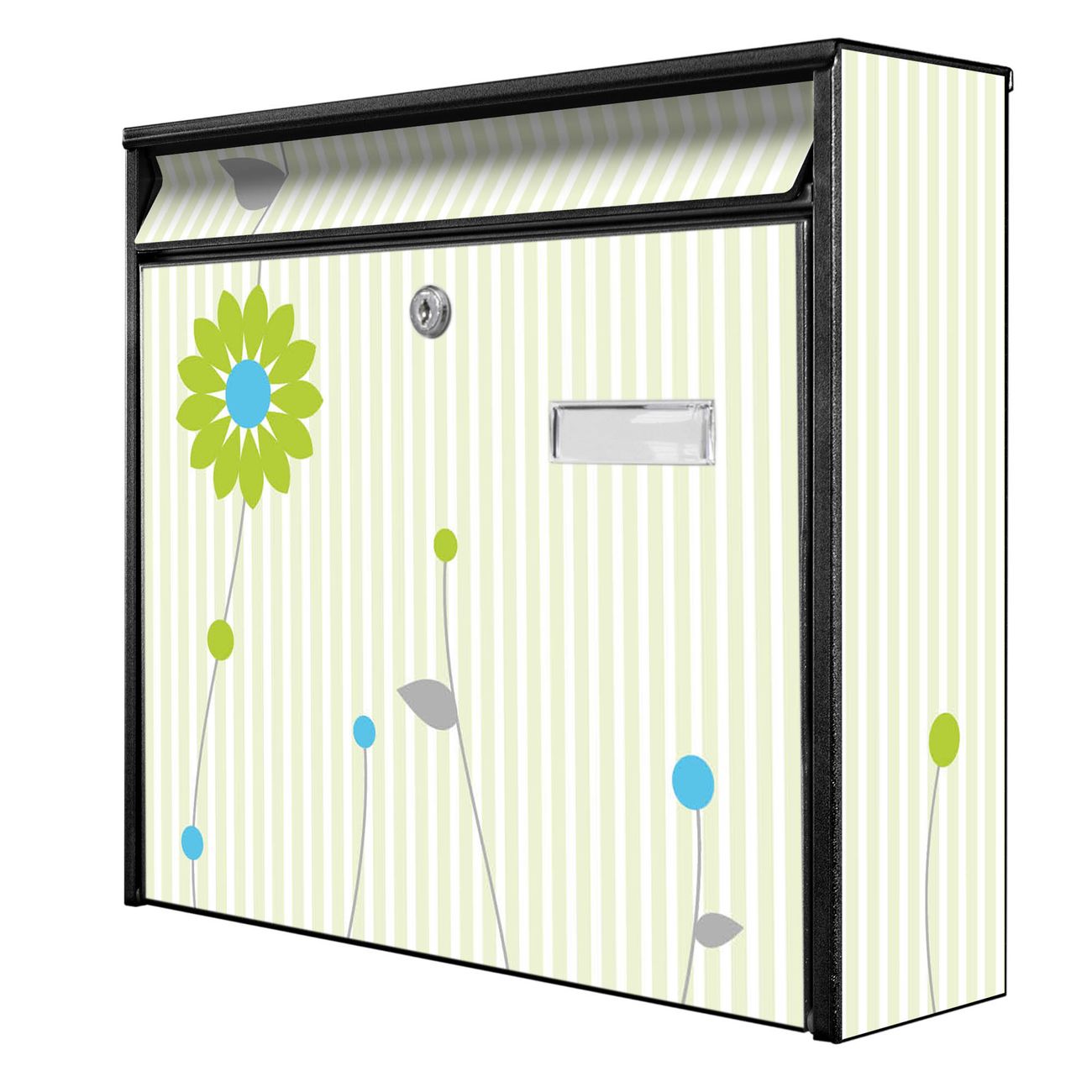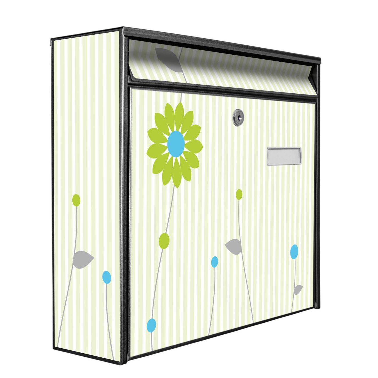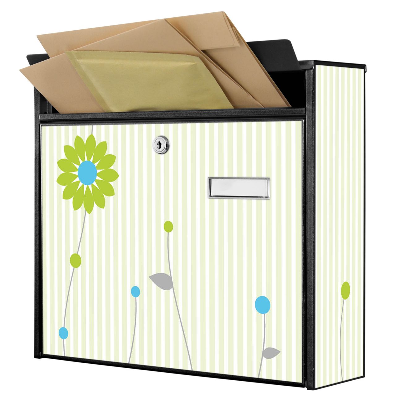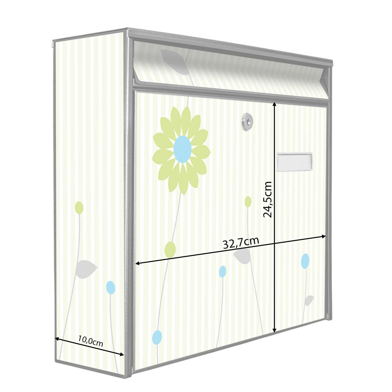 Der Burg Wächter Mail Briefkasten mit Motiv Zarte Blumen bietet Ihnen mit seinem Fassungsvermögen genügend Platz auch für große A4 Sendungen. Auf Wunsch können Sie bei uns den passenden Standfuß kaufen und so aus dem Wandbriefkasten einen Standbriefkasten machen. Wir bieten Ihnen ebenfalls Namensschilder, bereits beschriftet oder frei zu beschriften, und verschiedene selbst gestaltete Bitte-Keine-Werbung-Aufkleber.