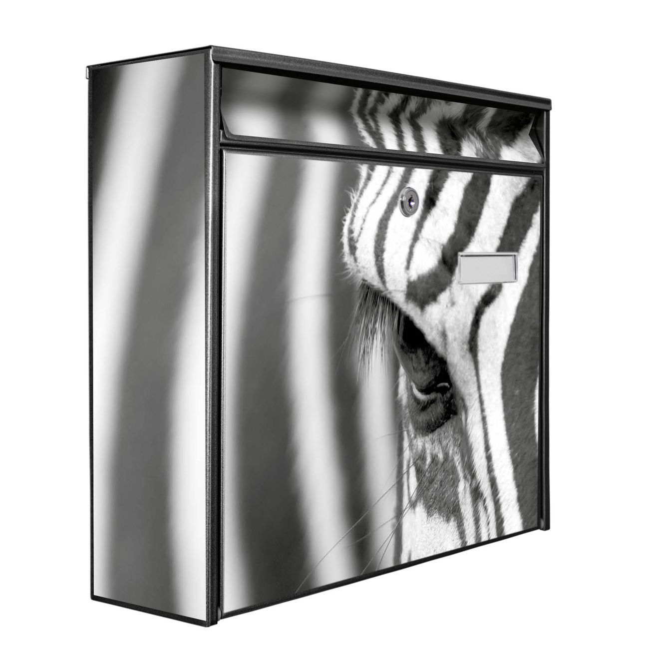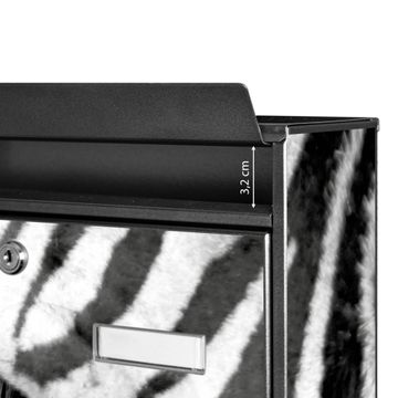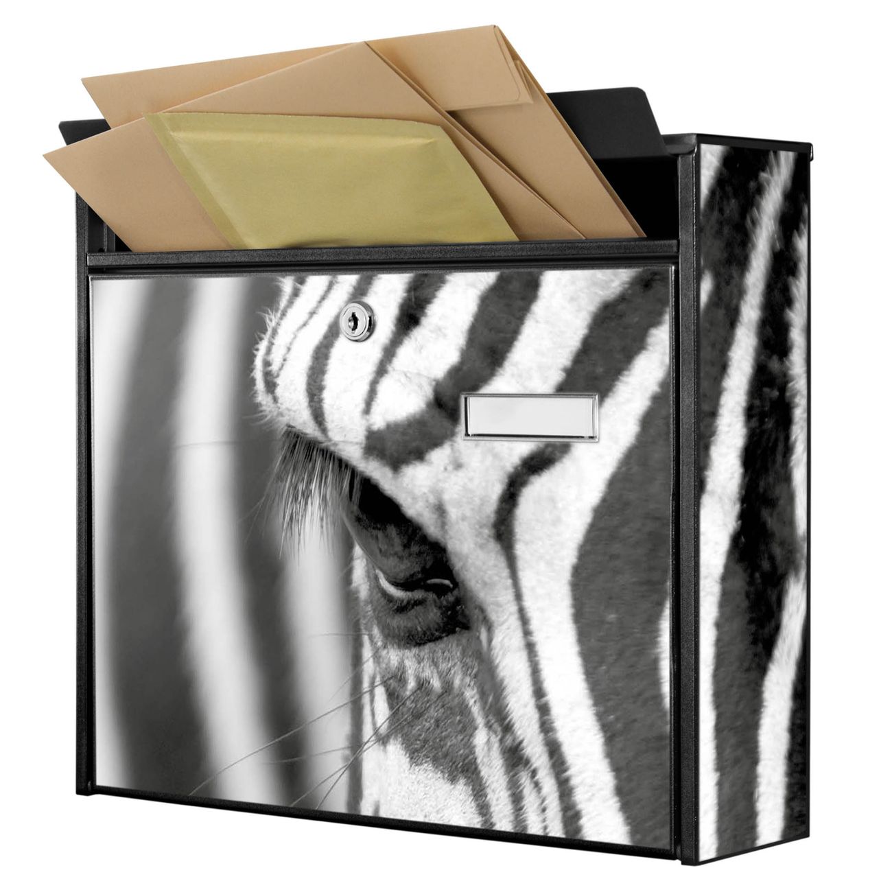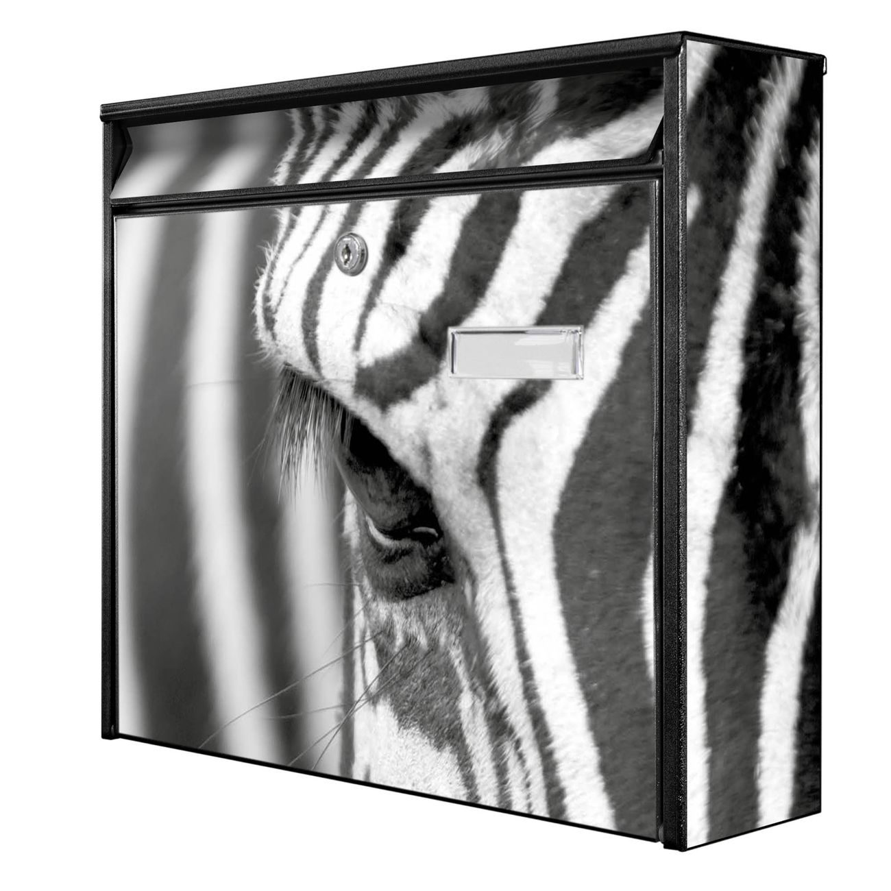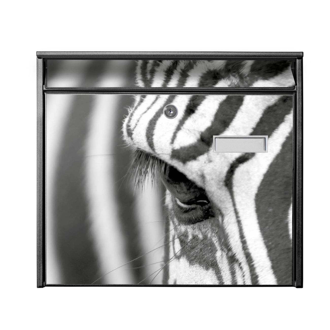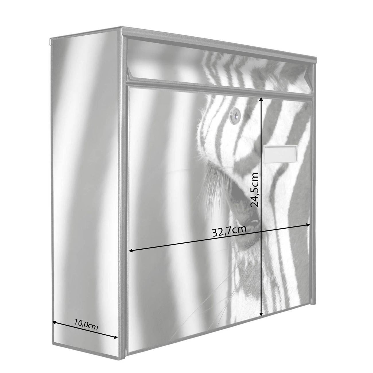Der Burg Wächter Mail Briefkasten mit Motiv Zebra En Face bietet Ihnen mit seinem Fassungsvermögen genügend Platz auch für große A4 Sendungen. Auf Wunsch können Sie bei uns den passenden Standfuß kaufen und so aus dem Wandbriefkasten einen Standbriefkasten machen. Wir bieten Ihnen ebenfalls Namensschilder, bereits beschriftet oder frei zu beschriften, und verschiedene selbst gestaltete Bitte-Keine-Werbung-Aufkleber.