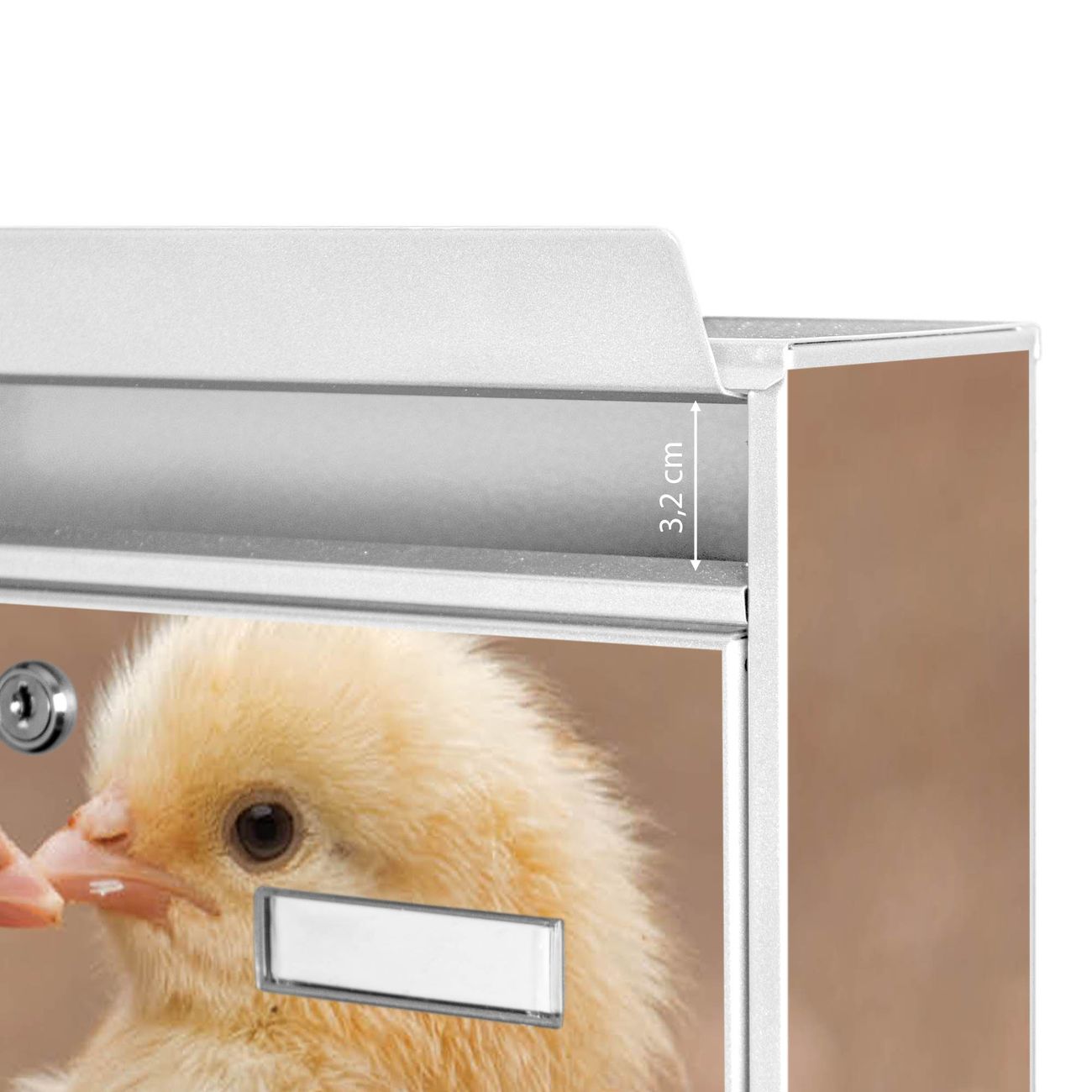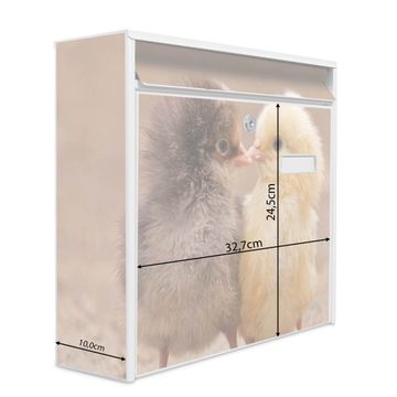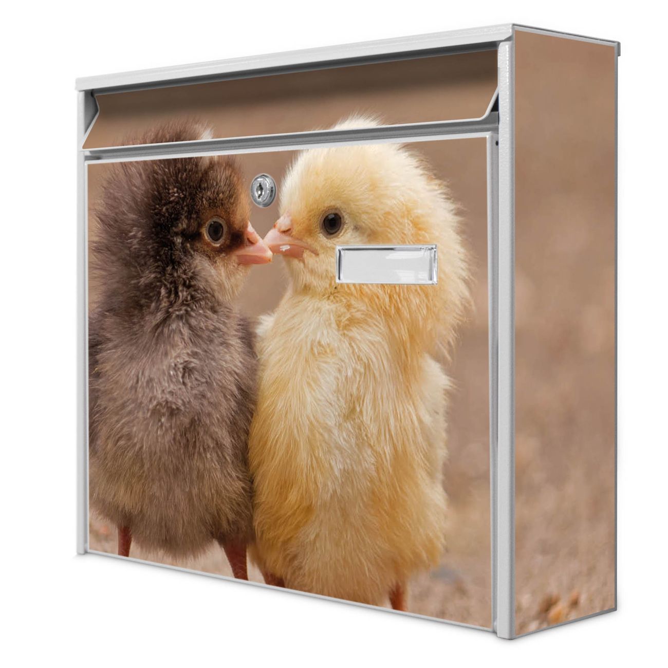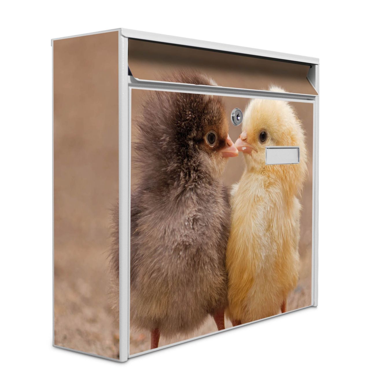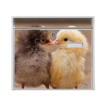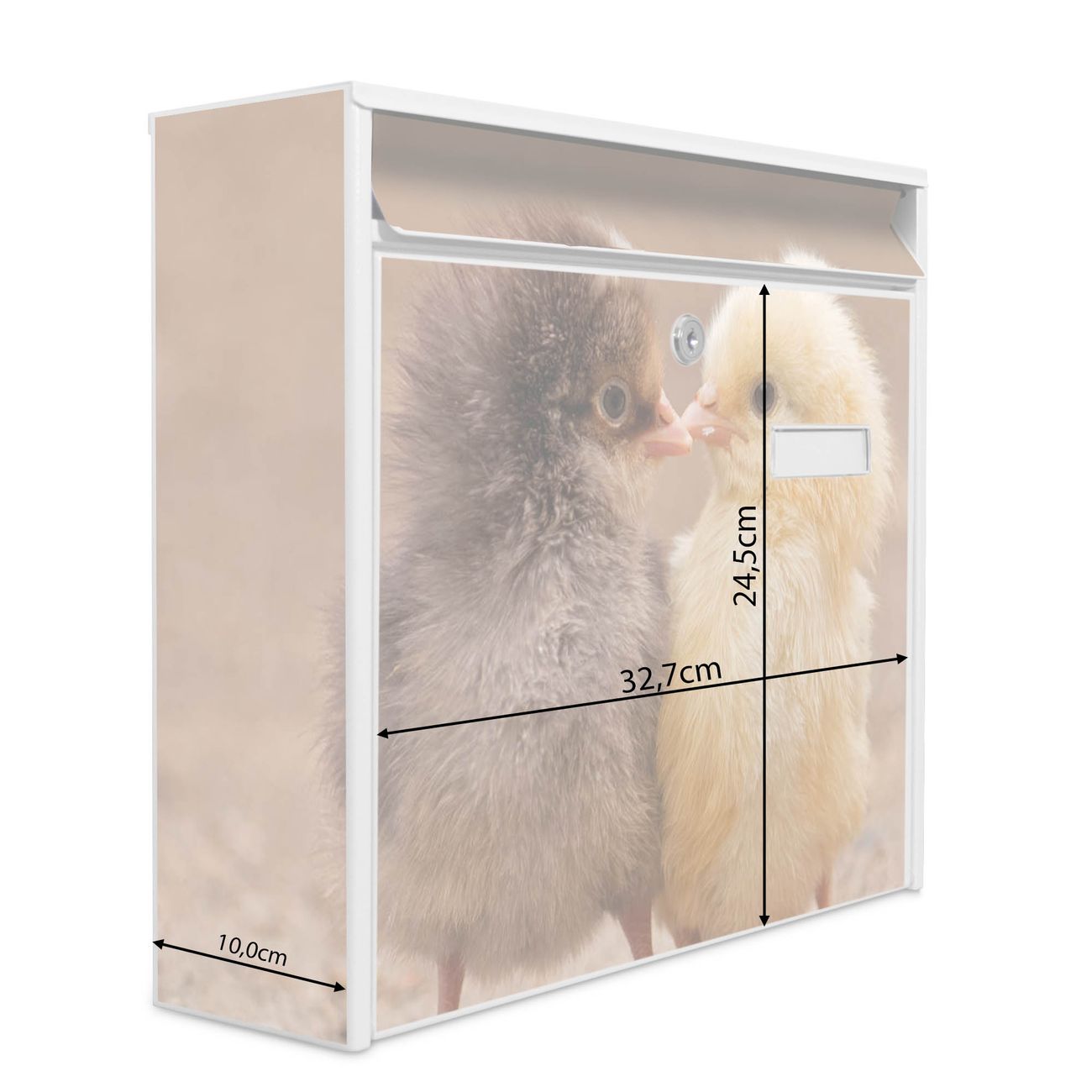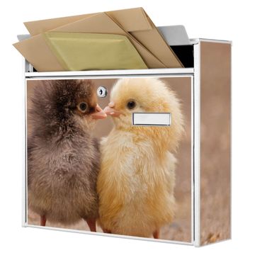 Der Burg Wächter Mail Briefkasten mit Motiv Zwei Küken bietet Ihnen mit seinem Fassungsvermögen genügend Platz auch für große A4 Sendungen. Auf Wunsch können Sie bei uns den passenden Standfuß kaufen und so aus dem Wandbriefkasten einen Standbriefkasten machen. Wir bieten Ihnen ebenfalls Namensschilder, bereits beschriftet oder frei zu beschriften, und verschiedene selbst gestaltete Bitte-Keine-Werbung-Aufkleber.