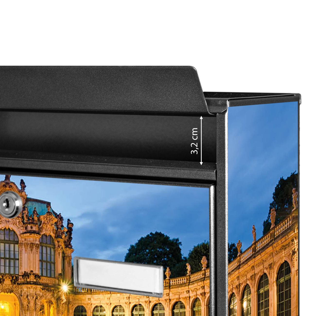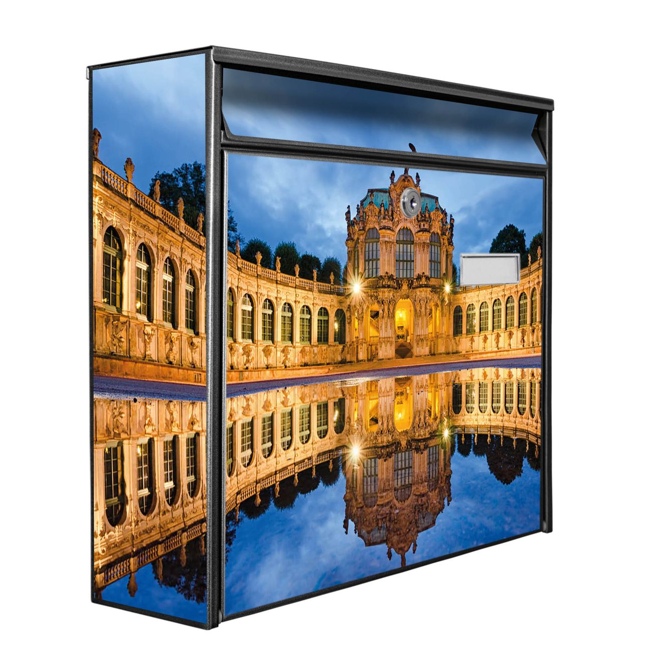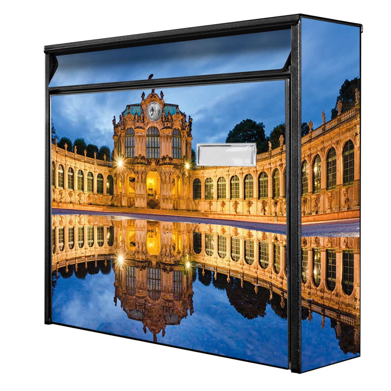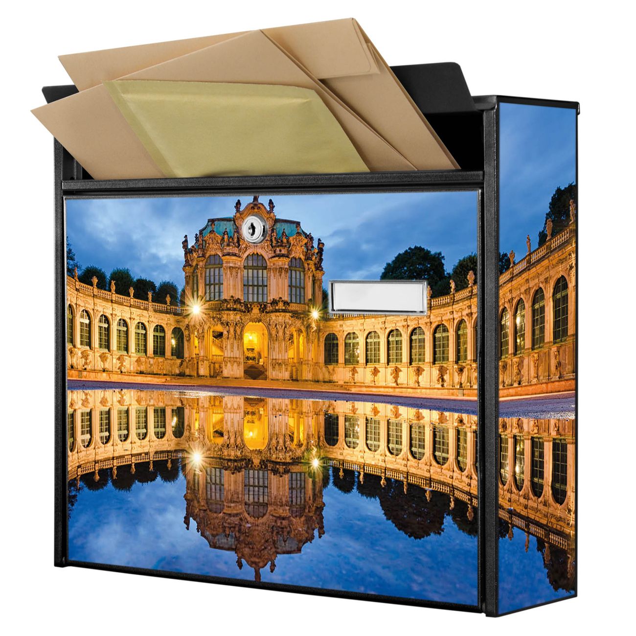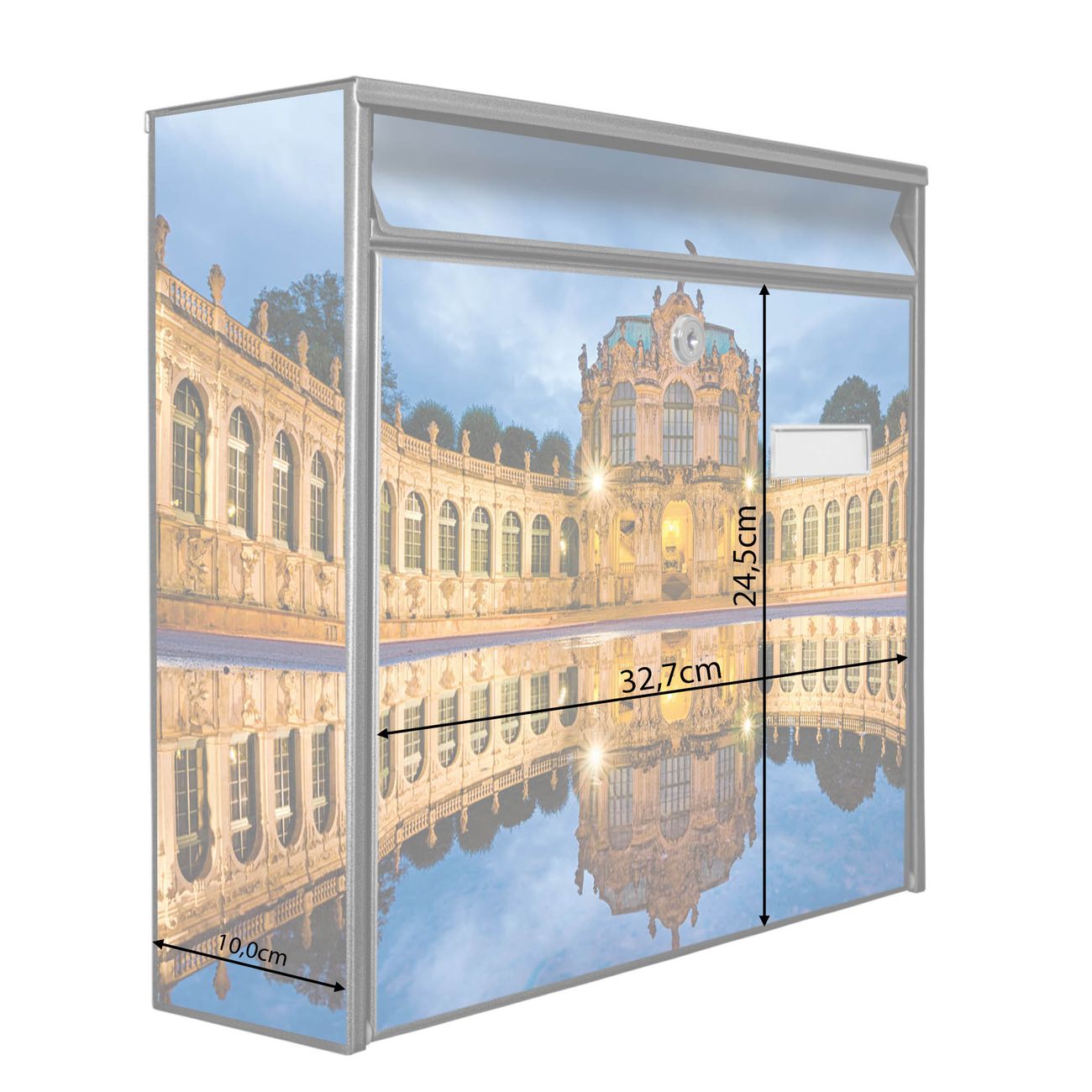 Der Burg Wächter Mail Briefkasten mit Motiv Zwinger Dresden bietet Ihnen mit seinem Fassungsvermögen genügend Platz auch für große A4 Sendungen. Auf Wunsch können Sie bei uns den passenden Standfuß kaufen und so aus dem Wandbriefkasten einen Standbriefkasten machen. Wir bieten Ihnen ebenfalls Namensschilder, bereits beschriftet oder frei zu beschriften, und verschiedene selbst gestaltete Bitte-Keine-Werbung-Aufkleber.