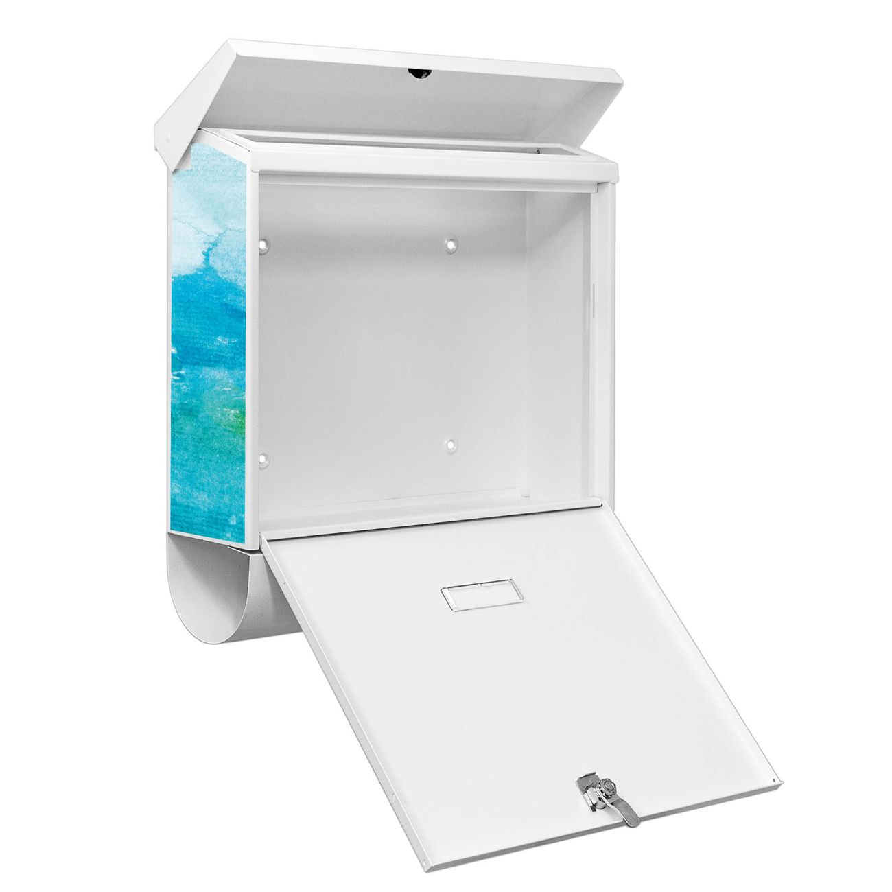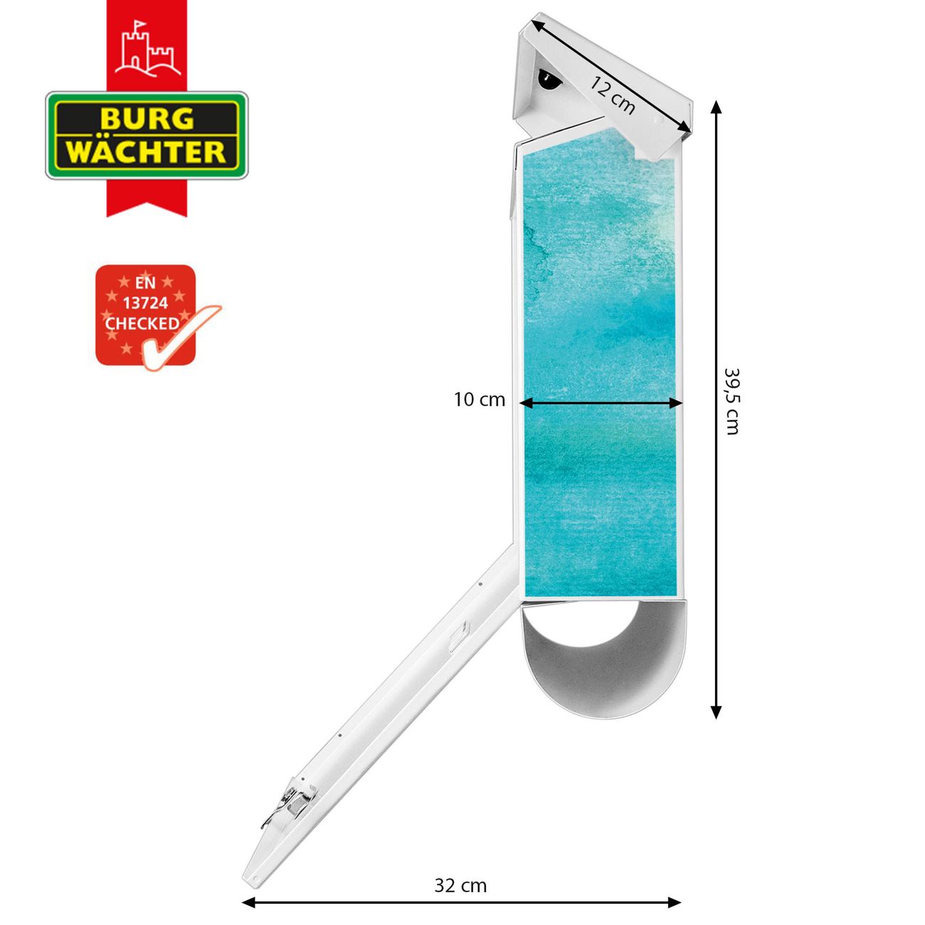 Der BURG-WÄCHTER Stahl Briefkasten mit Aquarell Blau Motiv bietet Ihnen mit seinem Fassungsvermögen genügend Platz auch für große A4 Sendungen und Zeitschriften. Das integrierte Regendach schützt Ihre Post vor dem Eindringen von Regen.