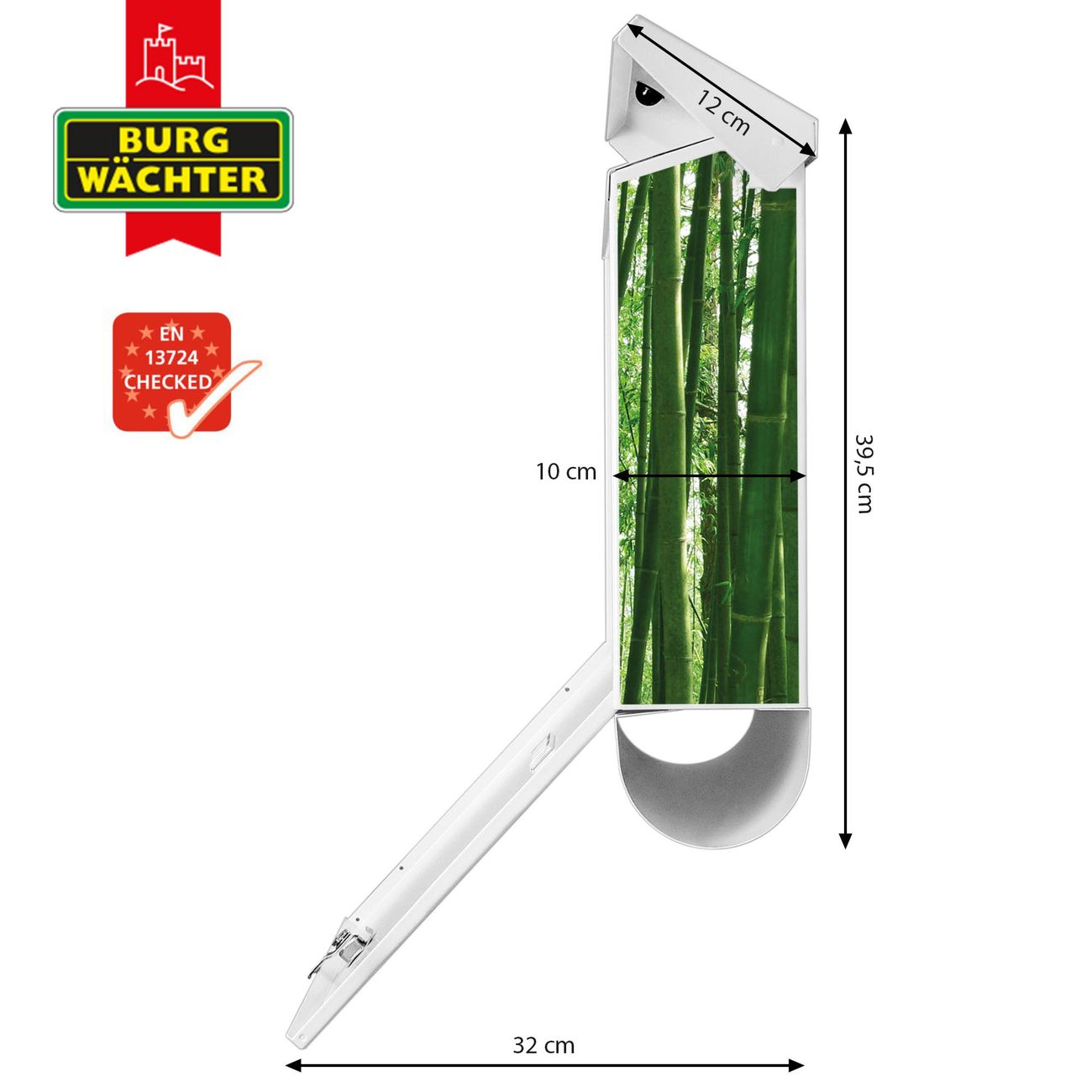 Der BURG-WÄCHTER Stahl Briefkasten mit Bambus Motiv bietet Ihnen mit seinem Fassungsvermögen genügend Platz auch für große A4 Sendungen und Zeitschriften. Das integrierte Regendach schützt Ihre Post vor dem Eindringen von Regen.