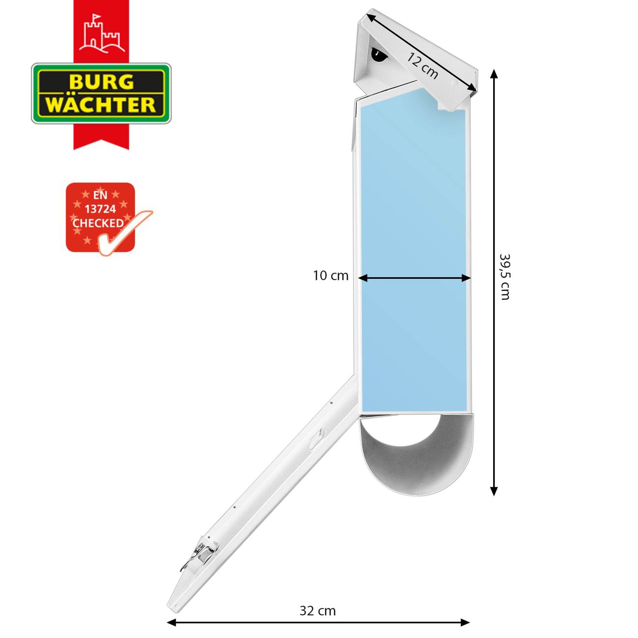 Der BURG-WÄCHTER Stahl Briefkasten mit Bergblaulilie Motiv bietet Ihnen mit seinem Fassungsvermögen genügend Platz auch für große A4 Sendungen und Zeitschriften. Das integrierte Regendach schützt Ihre Post vor dem Eindringen von Regen.