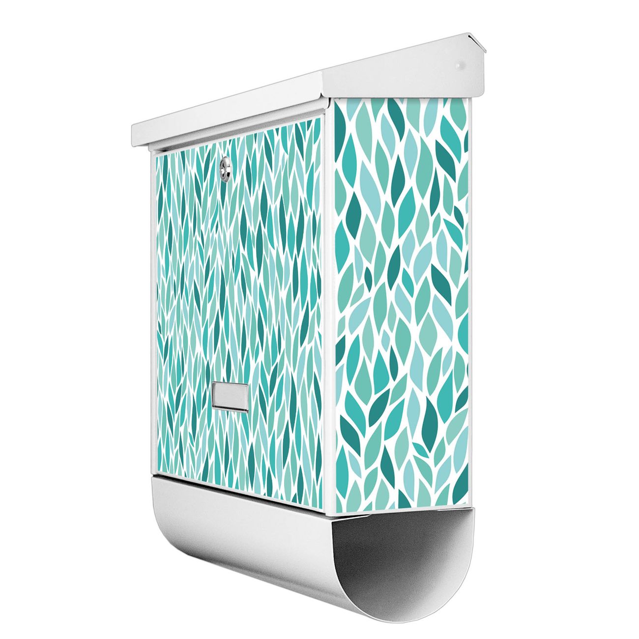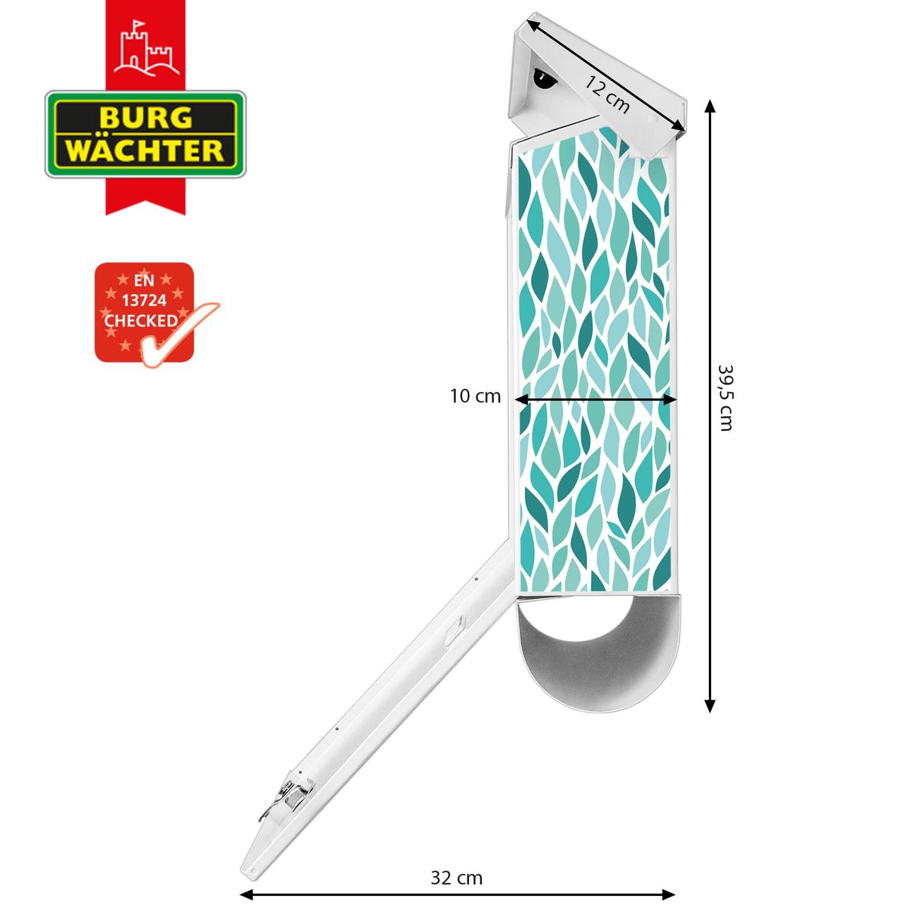 Der BURG-WÄCHTER Stahl Briefkasten mit Blätter Mint Motiv bietet Ihnen mit seinem Fassungsvermögen genügend Platz auch für große A4 Sendungen und Zeitschriften. Das integrierte Regendach schützt Ihre Post vor dem Eindringen von Regen.