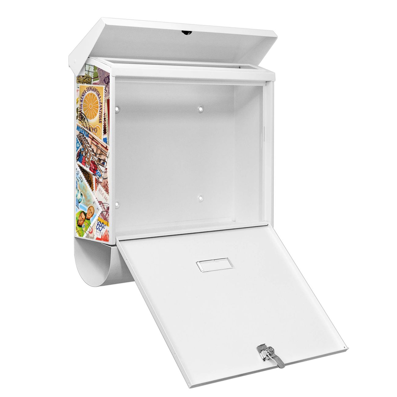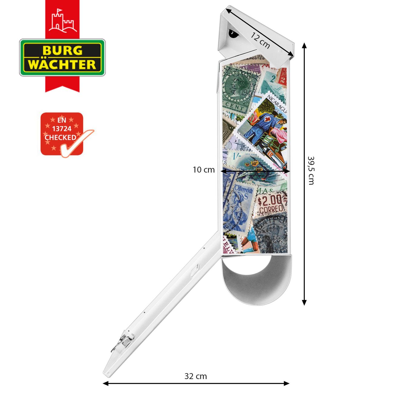Der BURG-WÄCHTER Stahl Briefkasten mit Briefmarken Motiv bietet Ihnen mit seinem Fassungsvermögen genügend Platz auch für große A4 Sendungen und Zeitschriften. Das integrierte Regendach schützt Ihre Post vor dem Eindringen von Regen.