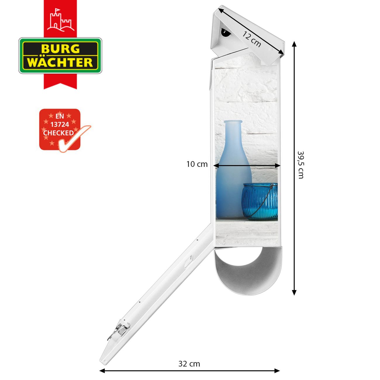 Der BURG-WÄCHTER Stahl Briefkasten mit Dekoartikel Blau Motiv bietet Ihnen mit seinem Fassungsvermögen genügend Platz auch für große A4 Sendungen und Zeitschriften. Das integrierte Regendach schützt Ihre Post vor dem Eindringen von Regen.