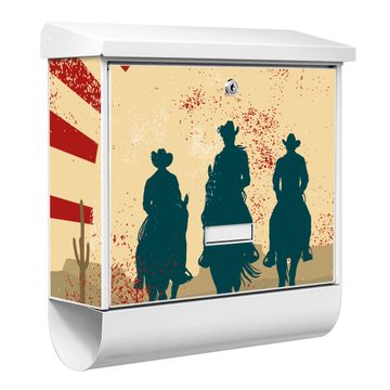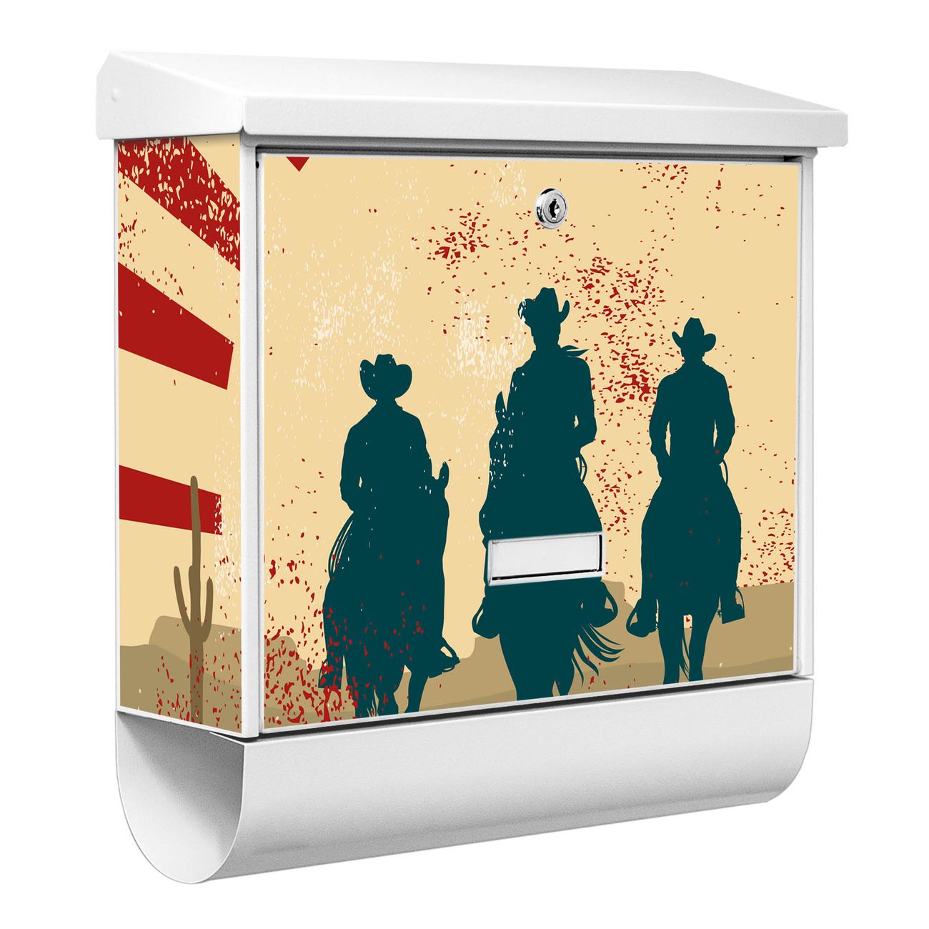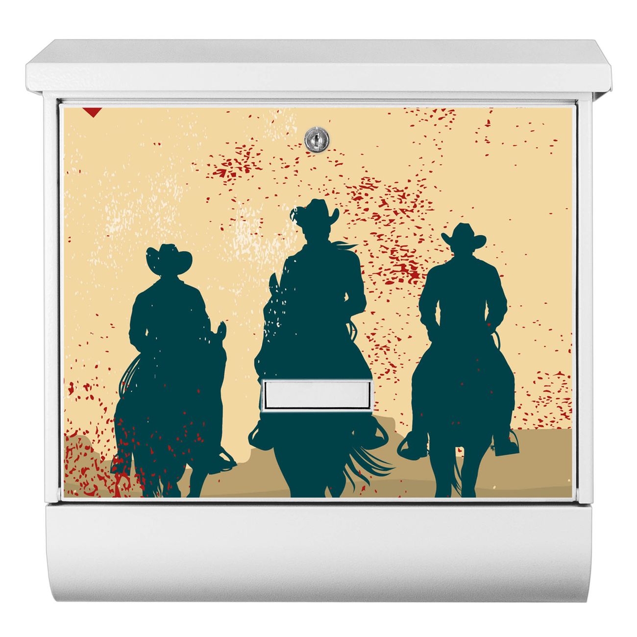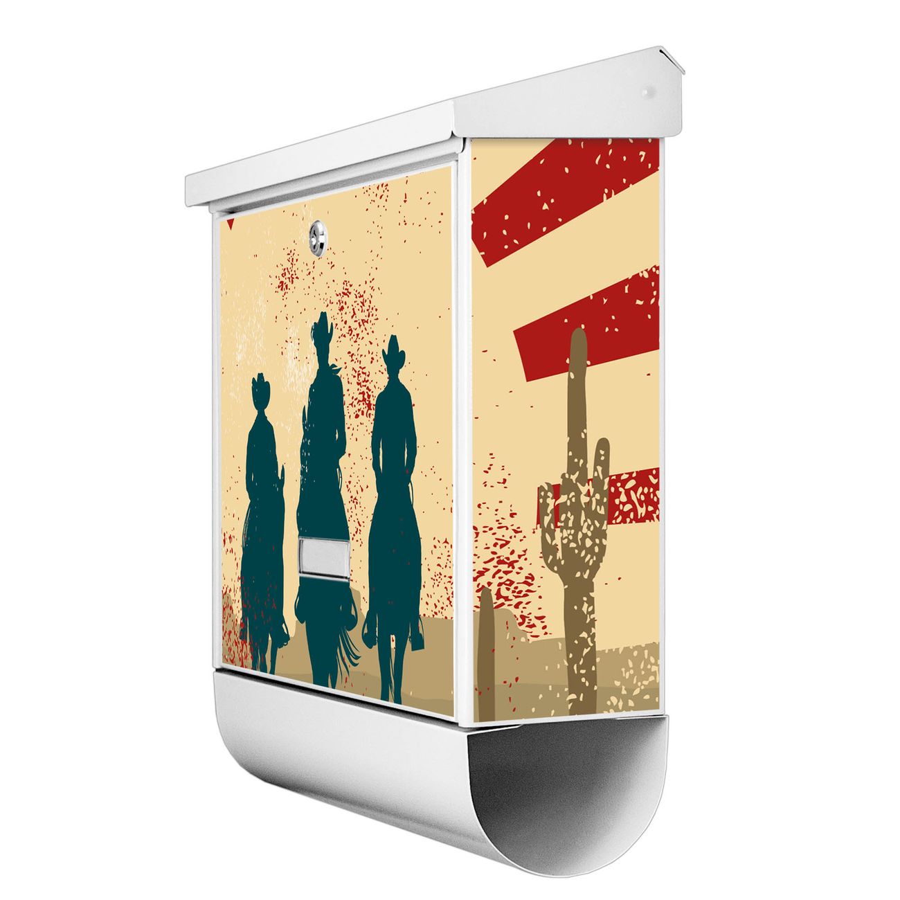 Der BURG-WÄCHTER Stahl Briefkasten mit Drei Cowboys Motiv bietet Ihnen mit seinem Fassungsvermögen genügend Platz auch für große A4 Sendungen und Zeitschriften. Das integrierte Regendach schützt Ihre Post vor dem Eindringen von Regen.