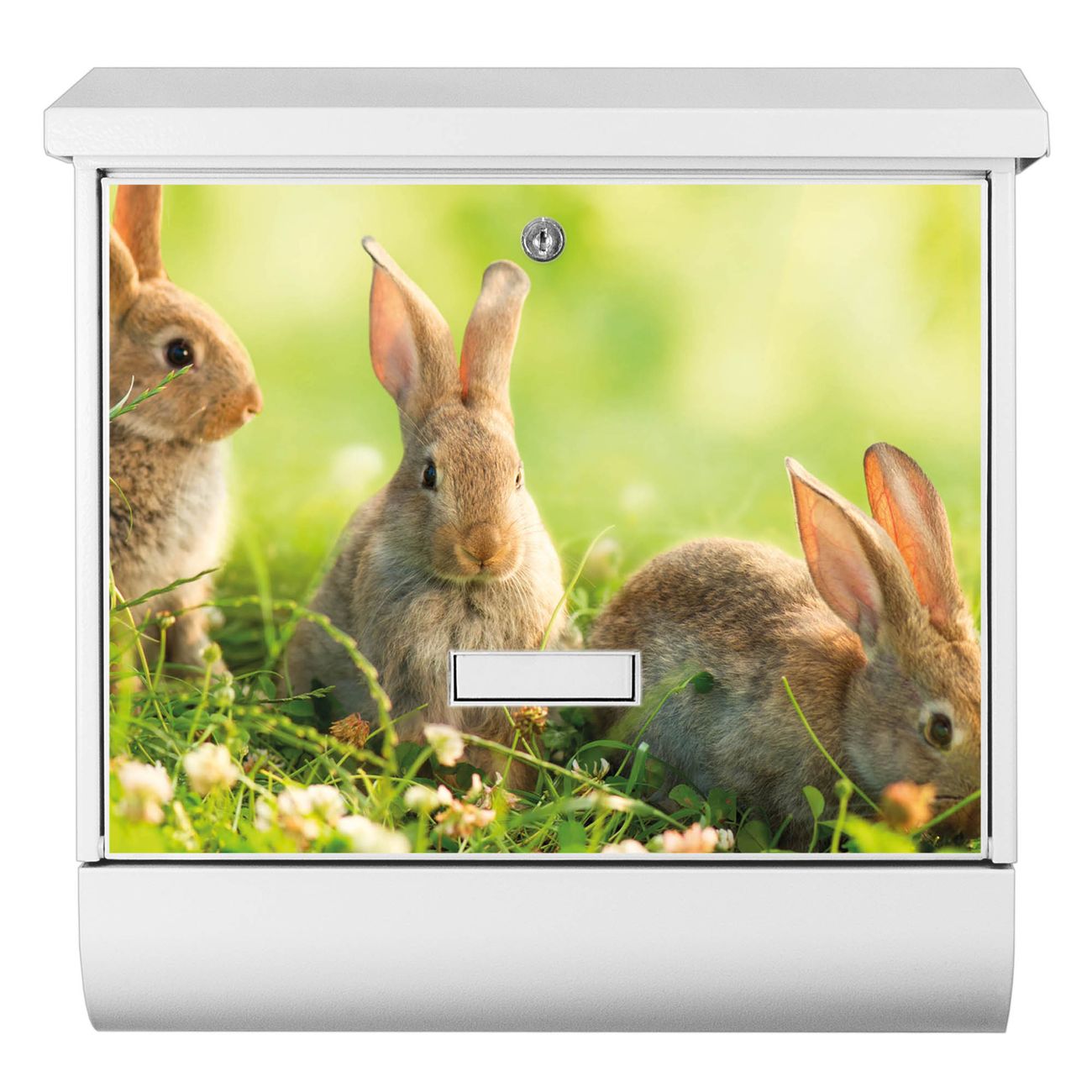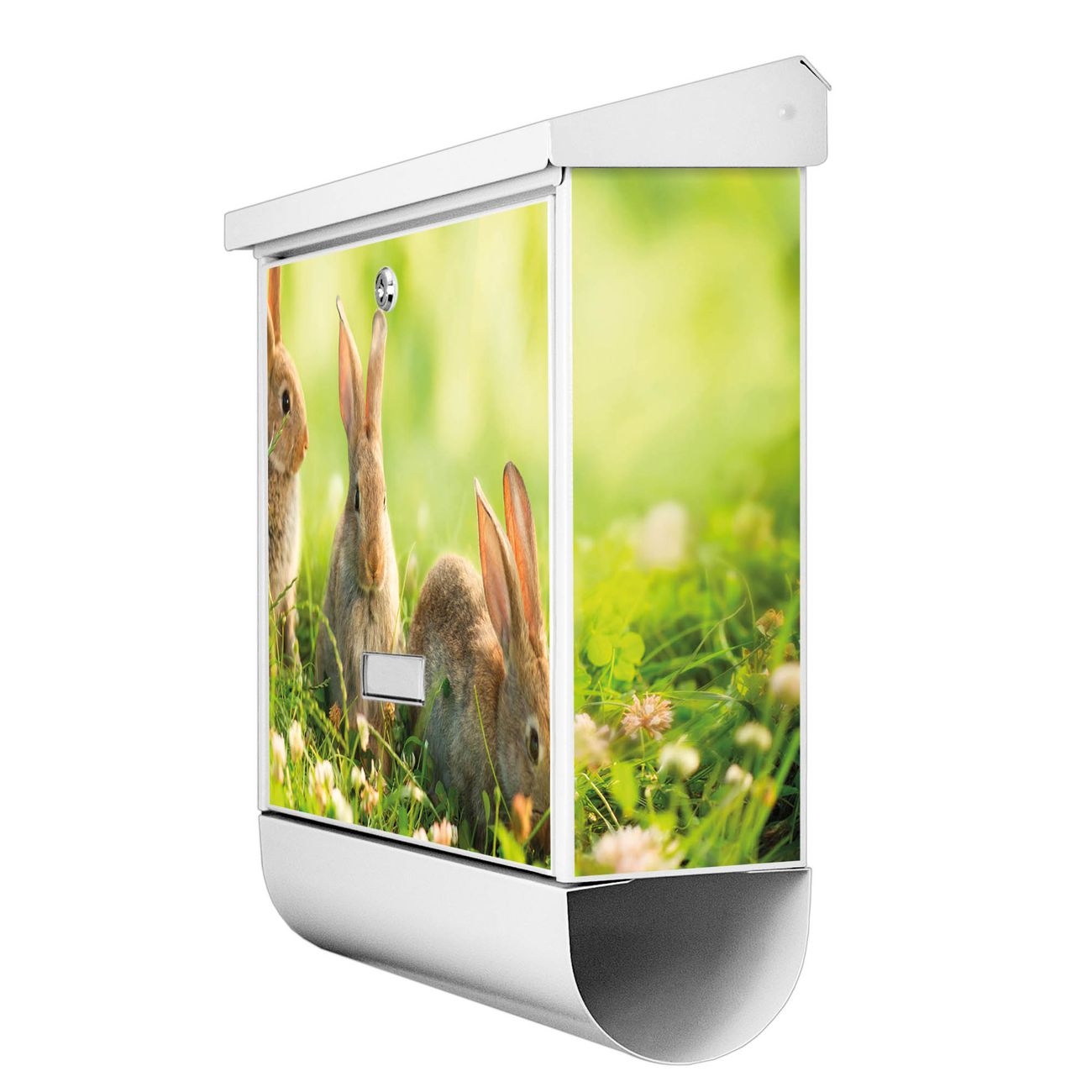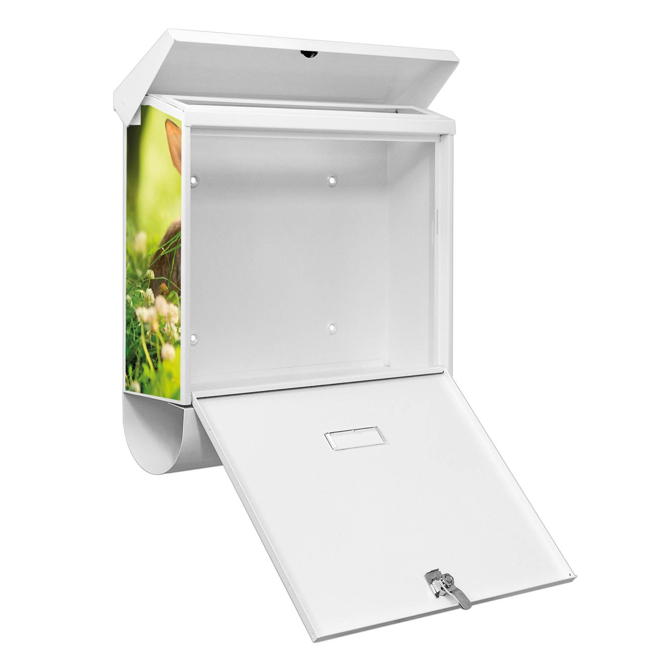 Der BURG-WÄCHTER Stahl Briefkasten mit Drei Hasen Motiv bietet Ihnen mit seinem Fassungsvermögen genügend Platz auch für große A4 Sendungen und Zeitschriften. Das integrierte Regendach schützt Ihre Post vor dem Eindringen von Regen.