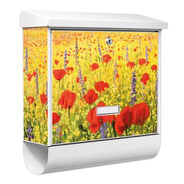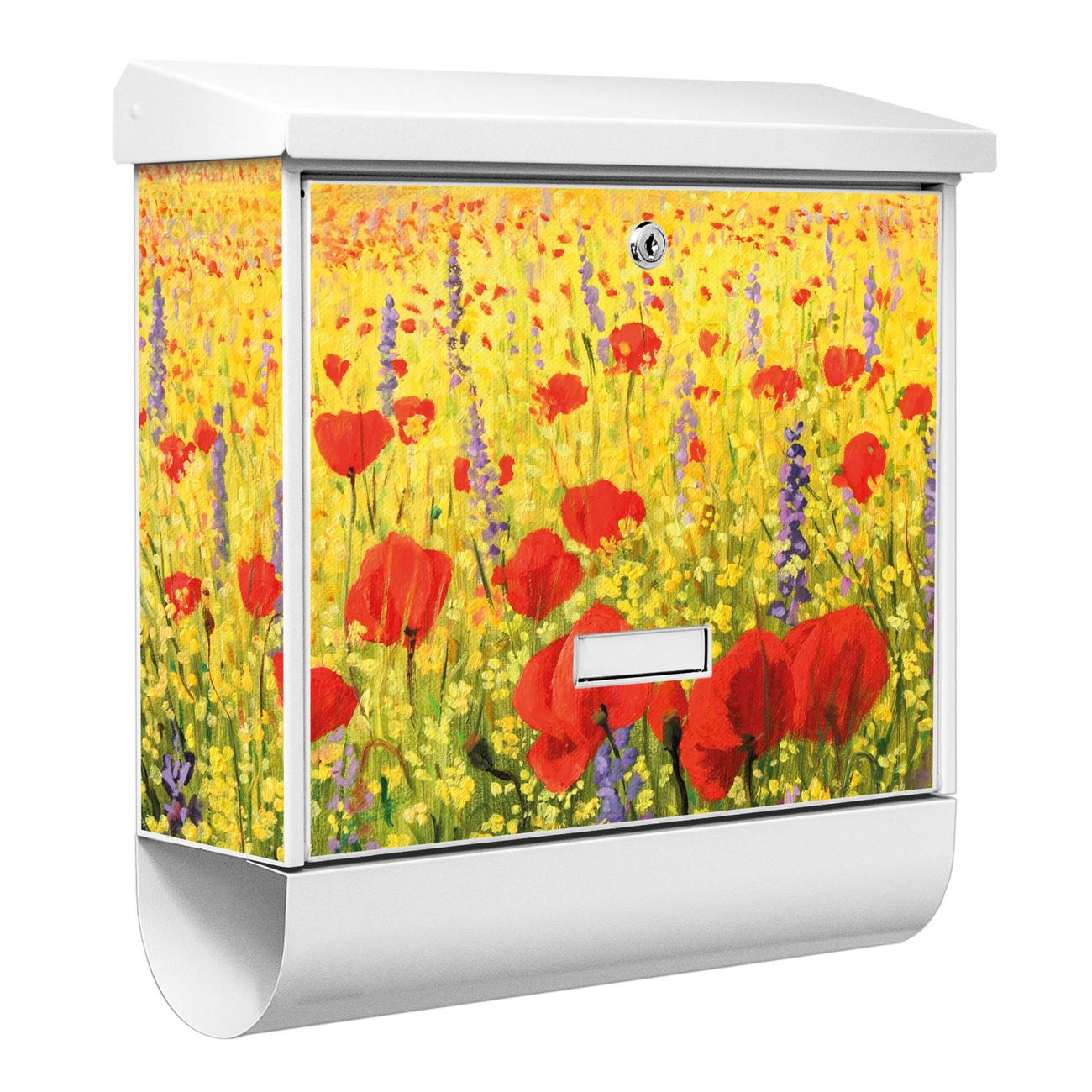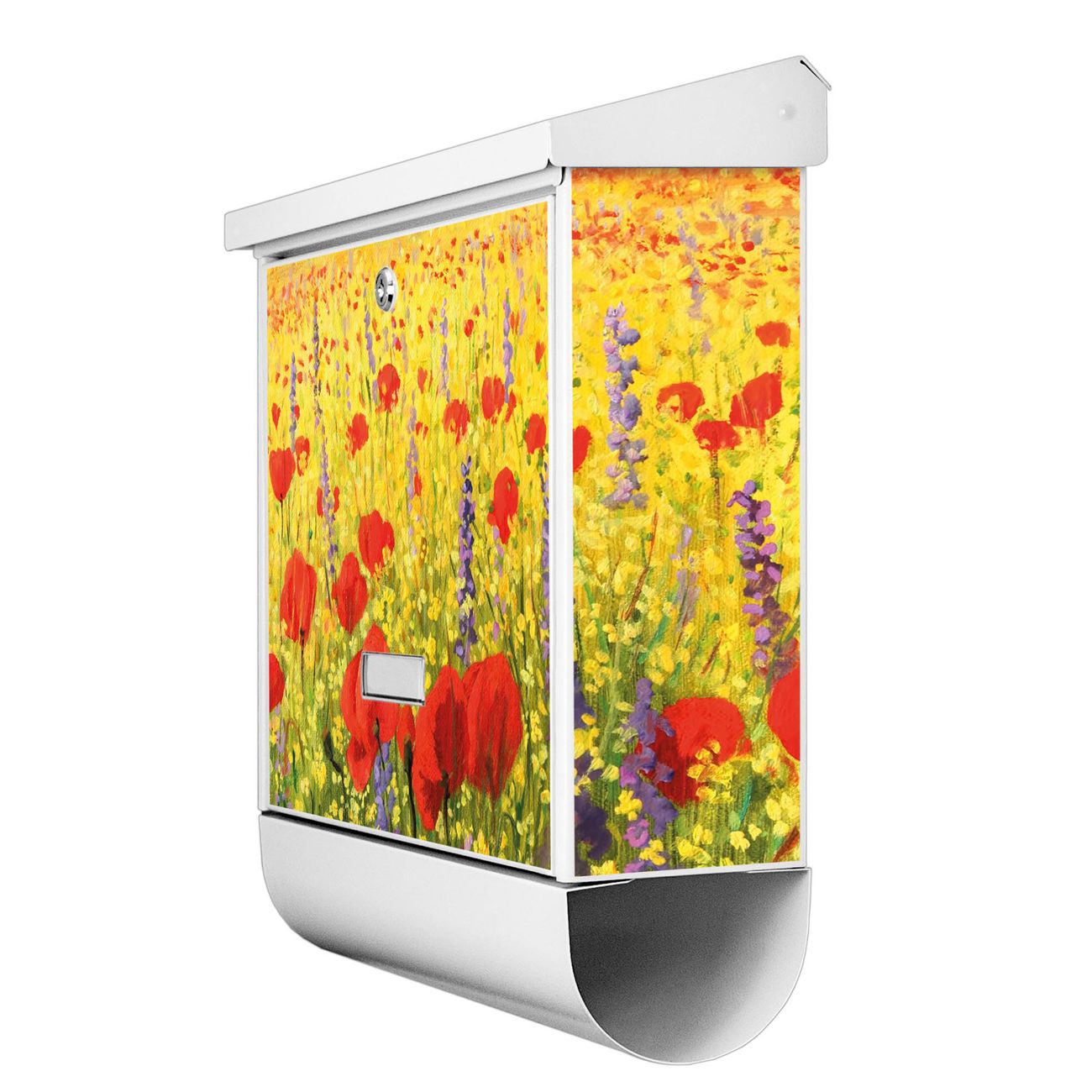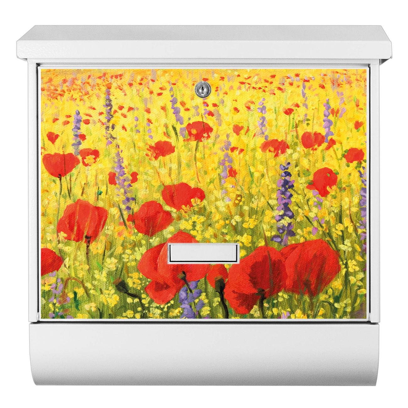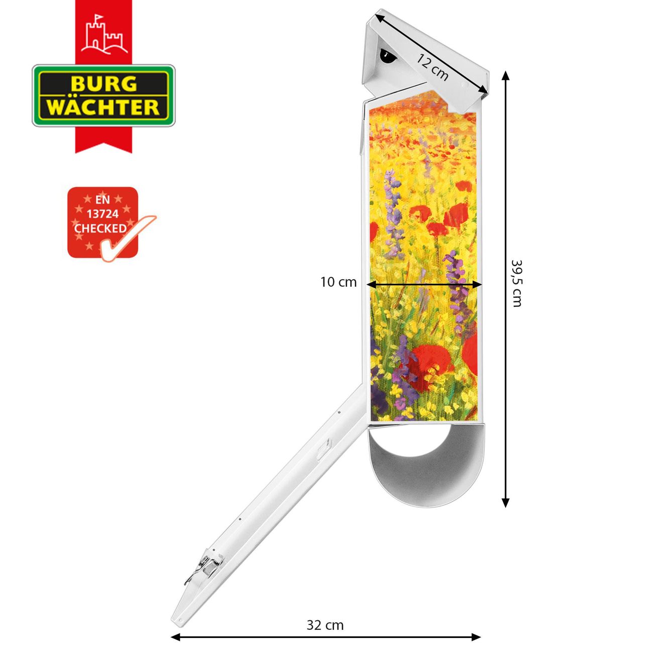 Der BURG-WÄCHTER Stahl Briefkasten mit Feld Mit Mohnblumen Motiv bietet Ihnen mit seinem Fassungsvermögen genügend Platz auch für große A4 Sendungen und Zeitschriften. Das integrierte Regendach schützt Ihre Post vor dem Eindringen von Regen.