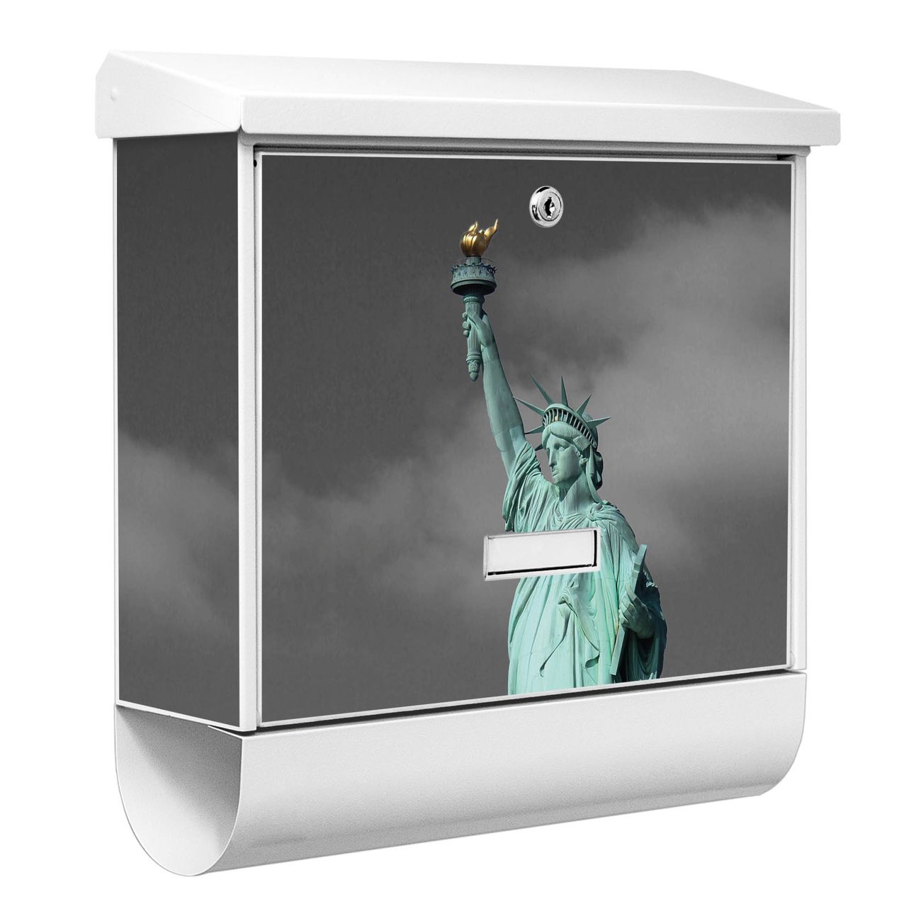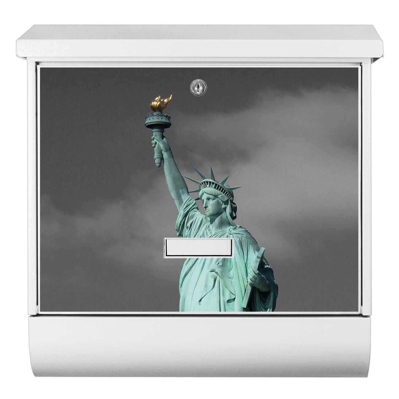 Der BURG-WÄCHTER Stahl Briefkasten mit Freiheitsstatue Motiv bietet Ihnen mit seinem Fassungsvermögen genügend Platz auch für große A4 Sendungen und Zeitschriften. Das integrierte Regendach schützt Ihre Post vor dem Eindringen von Regen.