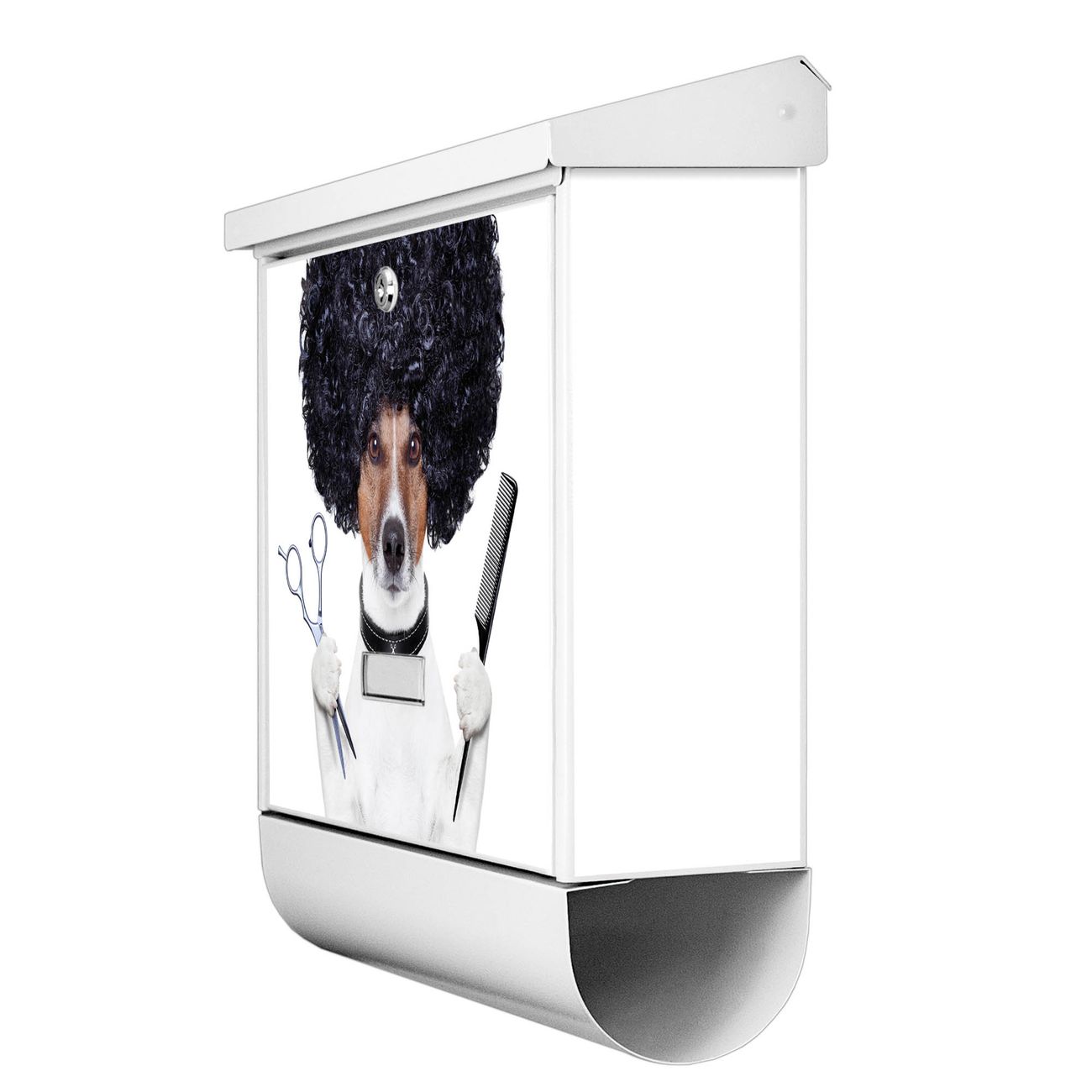 Der BURG-WÄCHTER Stahl Briefkasten mit Friseur Jack Russel Motiv bietet Ihnen mit seinem Fassungsvermögen genügend Platz auch für große A4 Sendungen und Zeitschriften. Das integrierte Regendach schützt Ihre Post vor dem Eindringen von Regen.