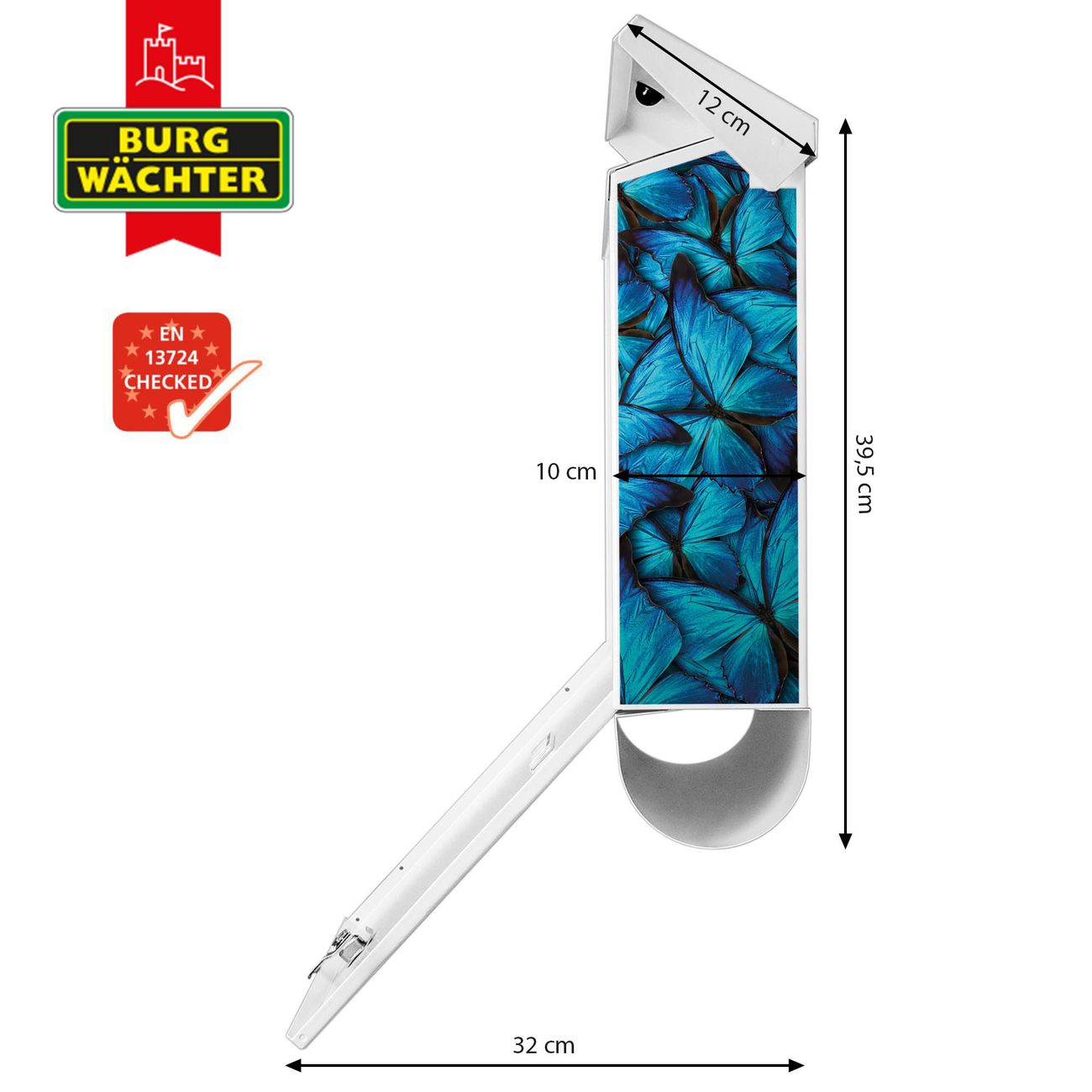 Der BURG-WÄCHTER Stahl Briefkasten mit Fürstliche Falter Motiv bietet Ihnen mit seinem Fassungsvermögen genügend Platz auch für große A4 Sendungen und Zeitschriften. Das integrierte Regendach schützt Ihre Post vor dem Eindringen von Regen.