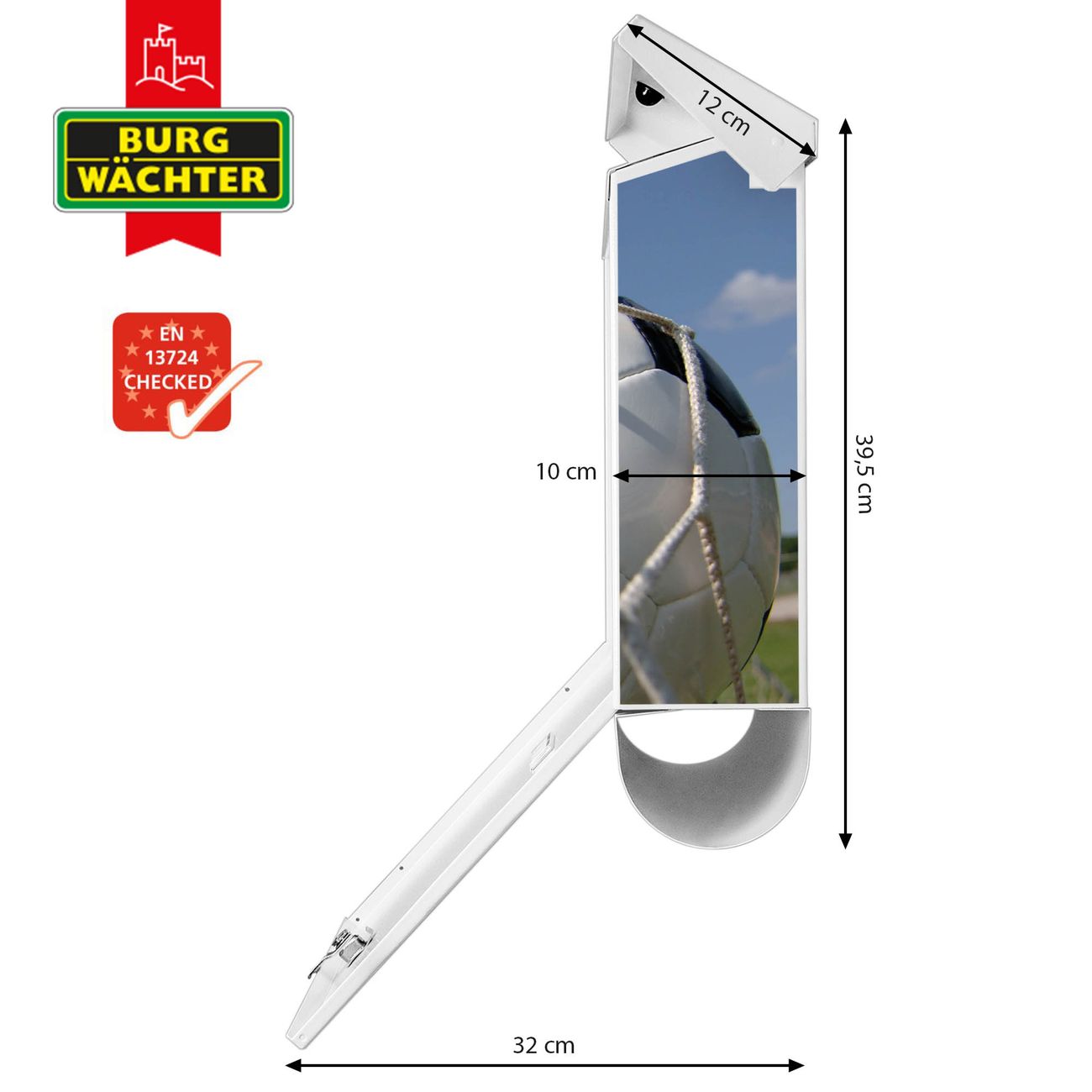 Der BURG-WÄCHTER Stahl Briefkasten mit Fußball Motiv bietet Ihnen mit seinem Fassungsvermögen genügend Platz auch für große A4 Sendungen und Zeitschriften. Das integrierte Regendach schützt Ihre Post vor dem Eindringen von Regen.