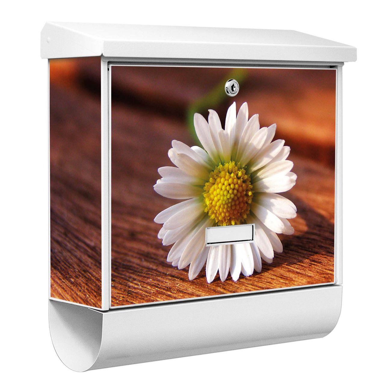 Der BURG-WÄCHTER Stahl Briefkasten mit Gänseblümchen Motiv bietet Ihnen mit seinem Fassungsvermögen genügend Platz auch für große A4 Sendungen und Zeitschriften. Das integrierte Regendach schützt Ihre Post vor dem Eindringen von Regen.