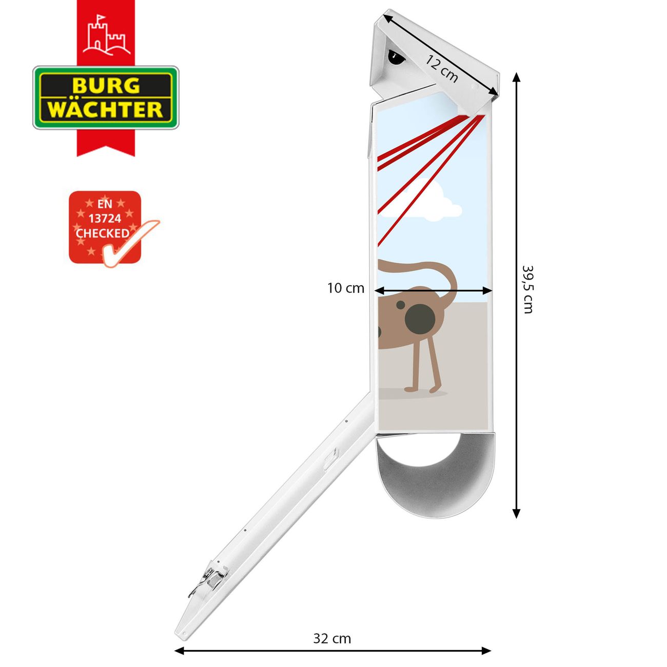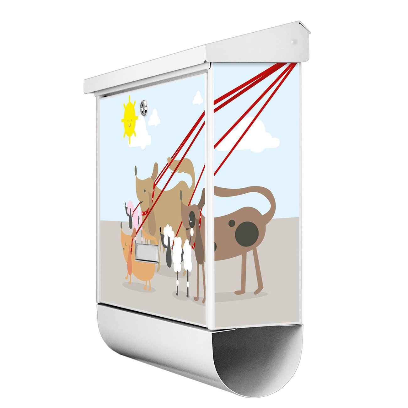 Der BURG-WÄCHTER Stahl Briefkasten mit Gassi Gehen Motiv bietet Ihnen mit seinem Fassungsvermögen genügend Platz auch für große A4 Sendungen und Zeitschriften. Das integrierte Regendach schützt Ihre Post vor dem Eindringen von Regen.