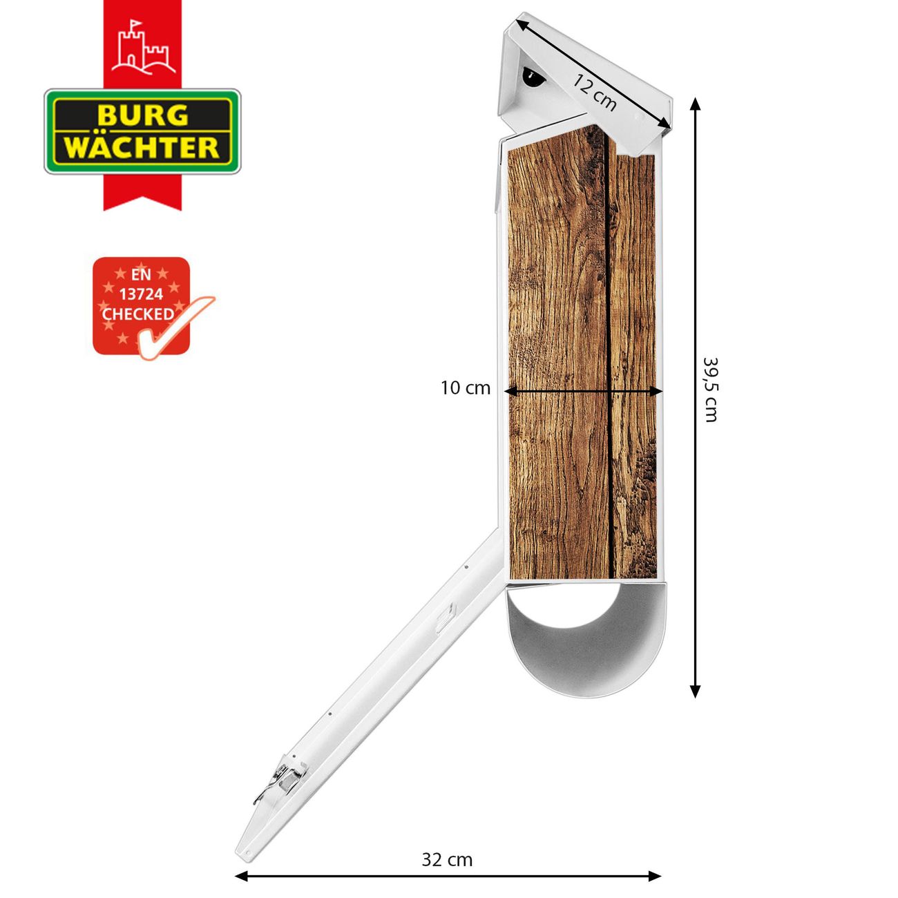Der BURG-WÄCHTER Stahl Briefkasten mit Geöltes Holz Motiv bietet Ihnen mit seinem Fassungsvermögen genügend Platz auch für große A4 Sendungen und Zeitschriften. Das integrierte Regendach schützt Ihre Post vor dem Eindringen von Regen.