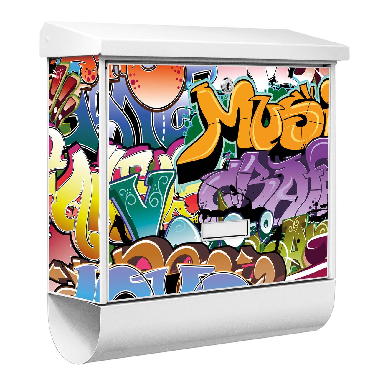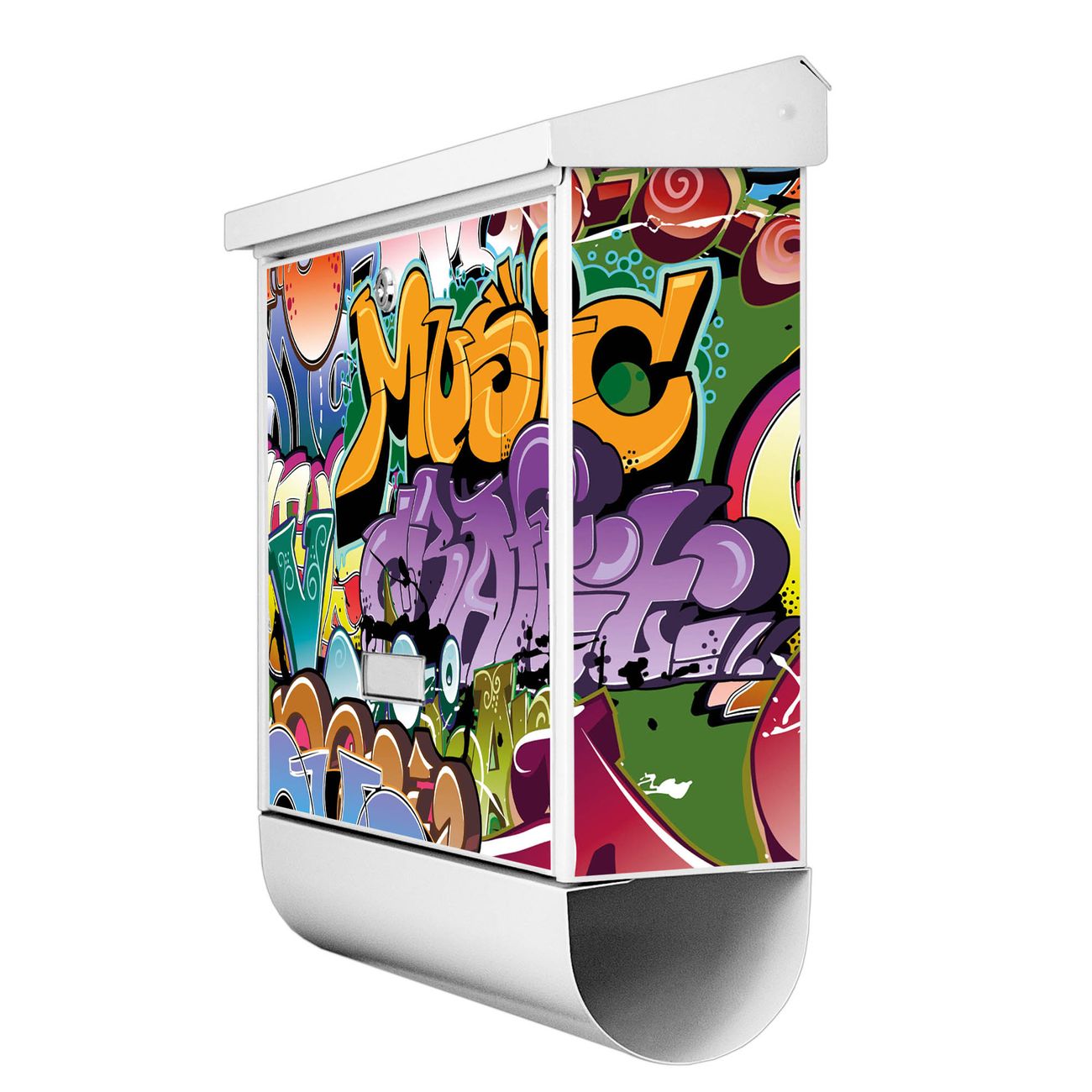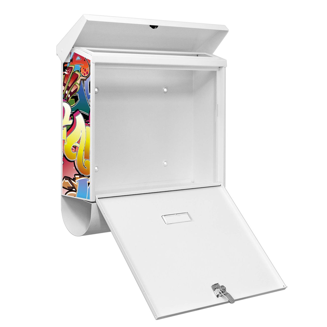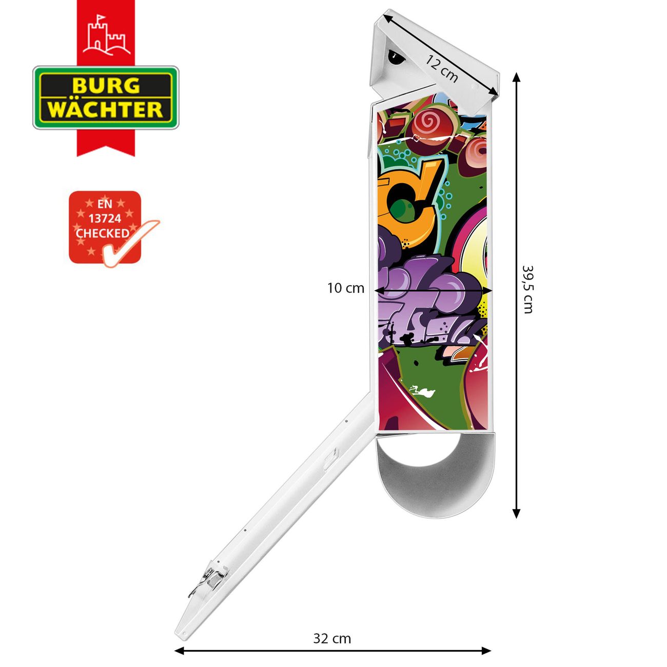 Der BURG-WÄCHTER Stahl Briefkasten mit Graffiti Motiv bietet Ihnen mit seinem Fassungsvermögen genügend Platz auch für große A4 Sendungen und Zeitschriften. Das integrierte Regendach schützt Ihre Post vor dem Eindringen von Regen.