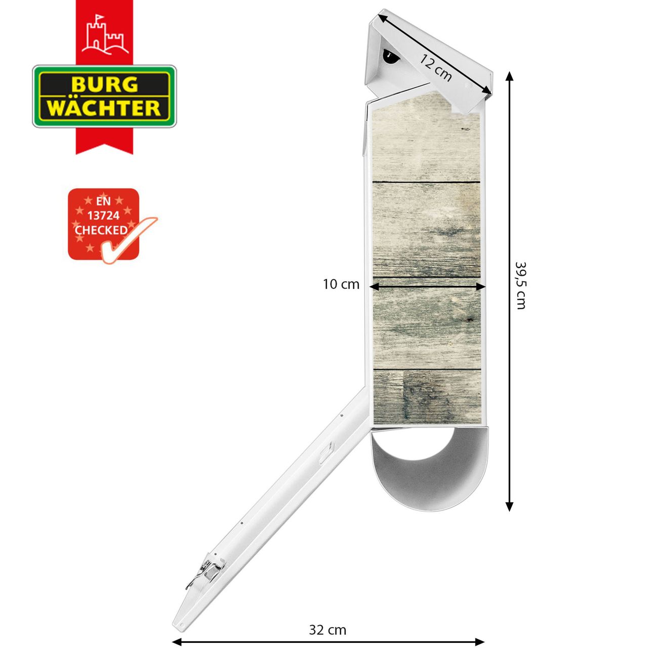 Der BURG-WÄCHTER Stahl Briefkasten mit Graue Planken Motiv bietet Ihnen mit seinem Fassungsvermögen genügend Platz auch für große A4 Sendungen und Zeitschriften. Das integrierte Regendach schützt Ihre Post vor dem Eindringen von Regen.