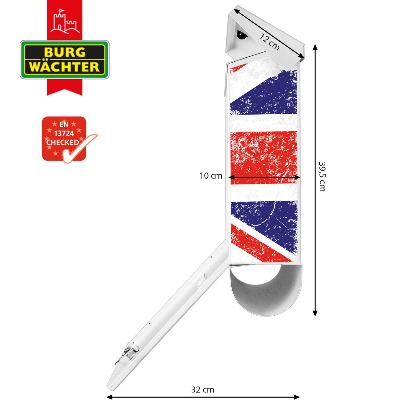Der BURG-WÄCHTER Stahl Briefkasten mit Great Britain Motiv bietet Ihnen mit seinem Fassungsvermögen genügend Platz auch für große A4 Sendungen und Zeitschriften. Das integrierte Regendach schützt Ihre Post vor dem Eindringen von Regen.