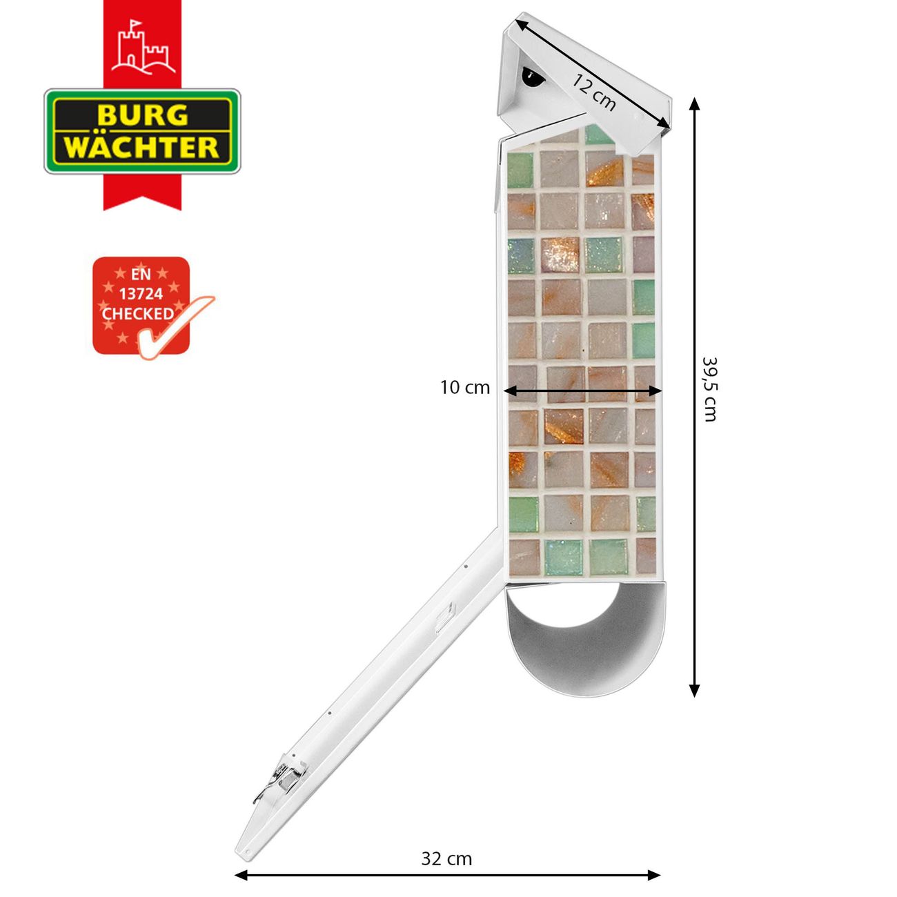 Der BURG-WÄCHTER Stahl Briefkasten mit Grüne Fliesen Motiv bietet Ihnen mit seinem Fassungsvermögen genügend Platz auch für große A4 Sendungen und Zeitschriften. Das integrierte Regendach schützt Ihre Post vor dem Eindringen von Regen.