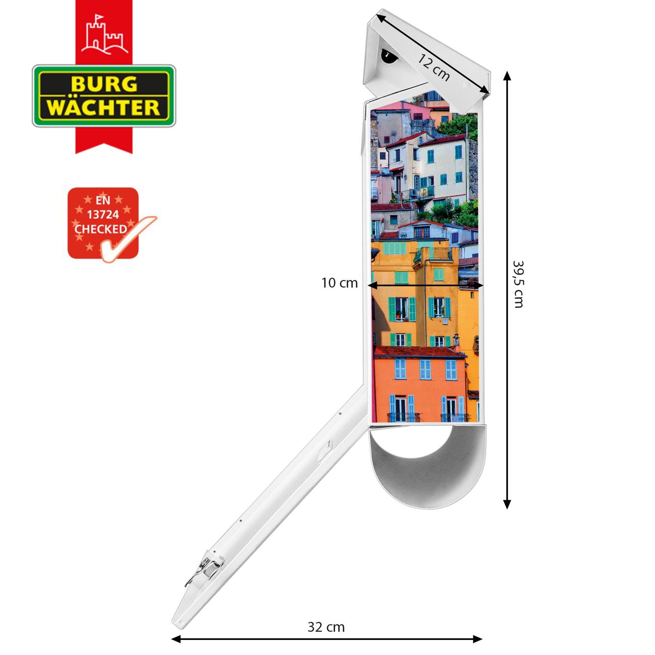 Der BURG-WÄCHTER Stahl Briefkasten mit Häuserberg Motiv bietet Ihnen mit seinem Fassungsvermögen genügend Platz auch für große A4 Sendungen und Zeitschriften. Das integrierte Regendach schützt Ihre Post vor dem Eindringen von Regen.