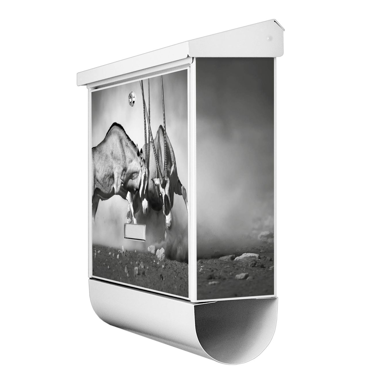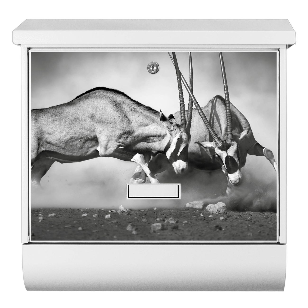 Der Briefkasten besteht aus Stahl, einem hochwertigen Material das äußerst unempfindlich gegenüber Witterungseinflüssen ist. Das Motiv besteht aus einer wetter- und UV-festen Folie, die Ihren Briefkasten zusätzlich vor Kratzern schützt. Der Postkasten ist 42,5cm hoch, 38cm breit und 11,5cm tief. Der Briefeinwurf ist 33,2cm x 3,1cm, Format DIN C4. Der Briefkasten wird mit Montagematerial und zwei Schlüsseln geliefert.