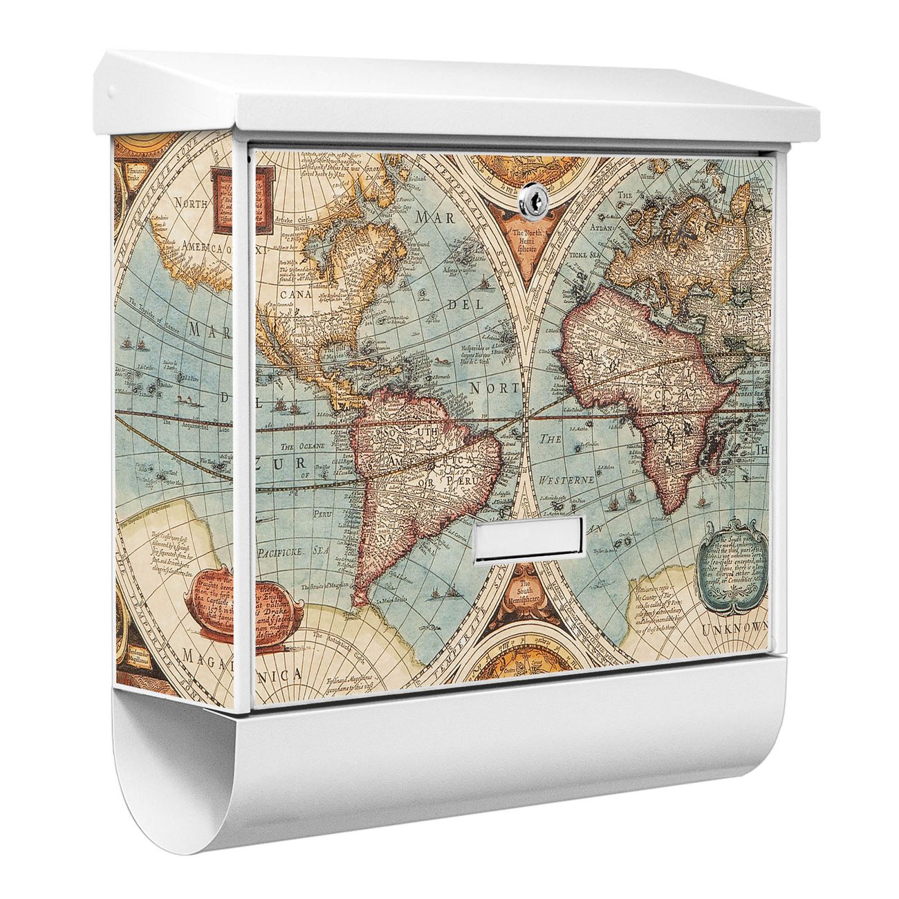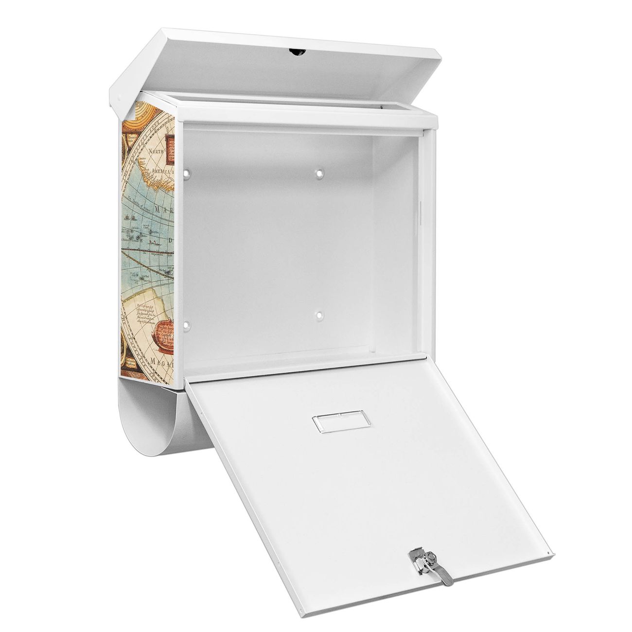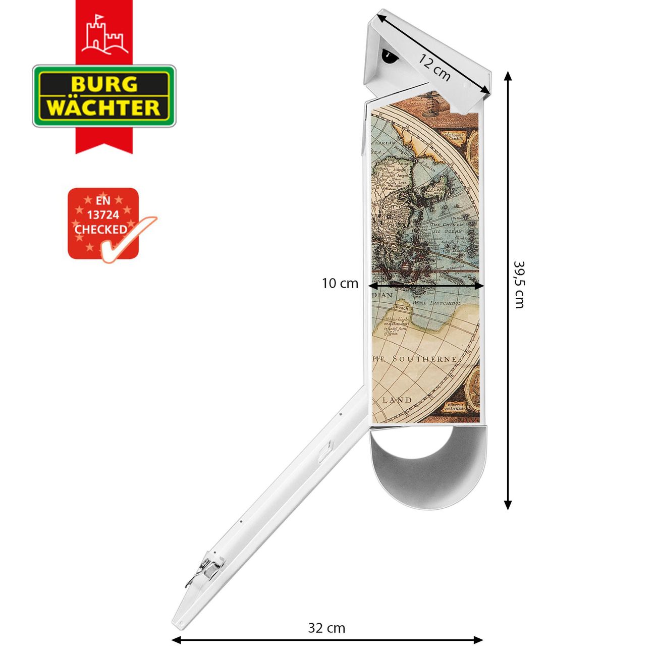 Der BURG-WÄCHTER Stahl Briefkasten mit Historische Weltkarte Motiv bietet Ihnen mit seinem Fassungsvermögen genügend Platz auch für große A4 Sendungen und Zeitschriften. Das integrierte Regendach schützt Ihre Post vor dem Eindringen von Regen.