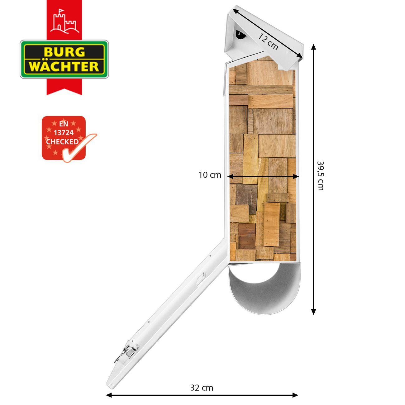 Der BURG-WÄCHTER Stahl Briefkasten mit Hölzernes Flickwerk Motiv bietet Ihnen mit seinem Fassungsvermögen genügend Platz auch für große A4 Sendungen und Zeitschriften. Das integrierte Regendach schützt Ihre Post vor dem Eindringen von Regen.