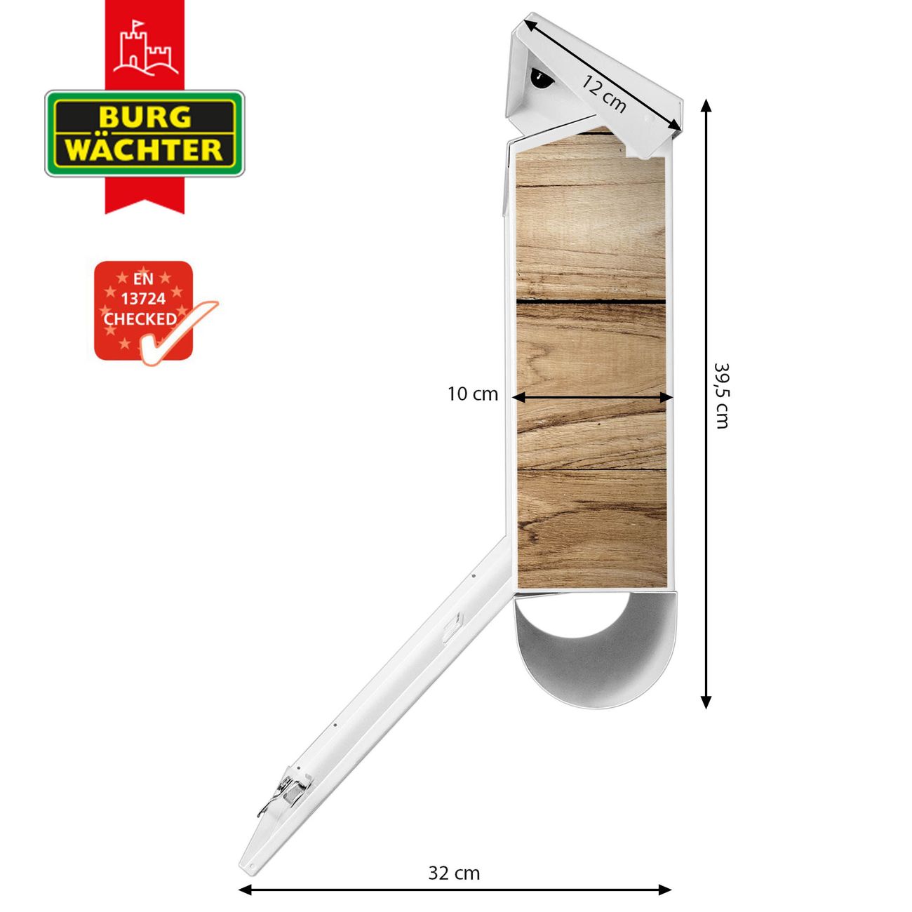 Der BURG-WÄCHTER Stahl Briefkasten mit Holzplanken Motiv bietet Ihnen mit seinem Fassungsvermögen genügend Platz auch für große A4 Sendungen und Zeitschriften. Das integrierte Regendach schützt Ihre Post vor dem Eindringen von Regen.