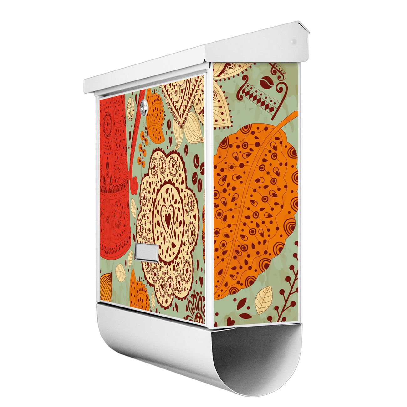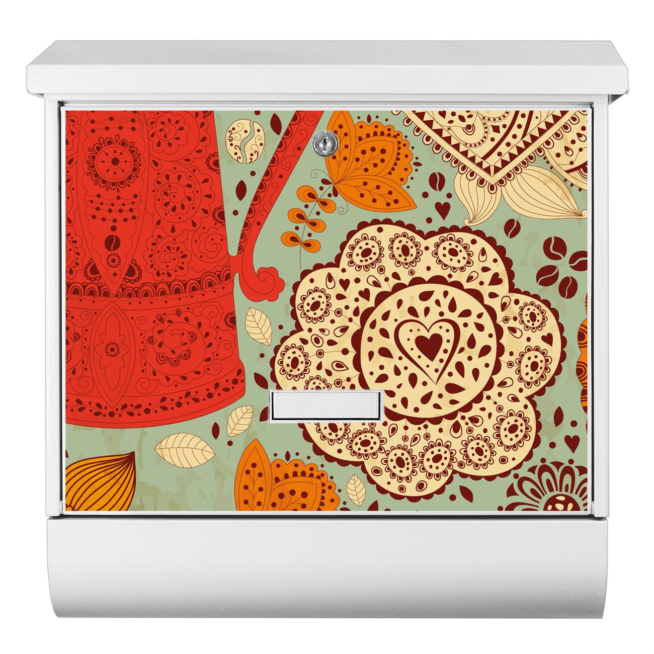 Der BURG-WÄCHTER Stahl Briefkasten mit Indischer Kaffee Motiv bietet Ihnen mit seinem Fassungsvermögen genügend Platz auch für große A4 Sendungen und Zeitschriften. Das integrierte Regendach schützt Ihre Post vor dem Eindringen von Regen.