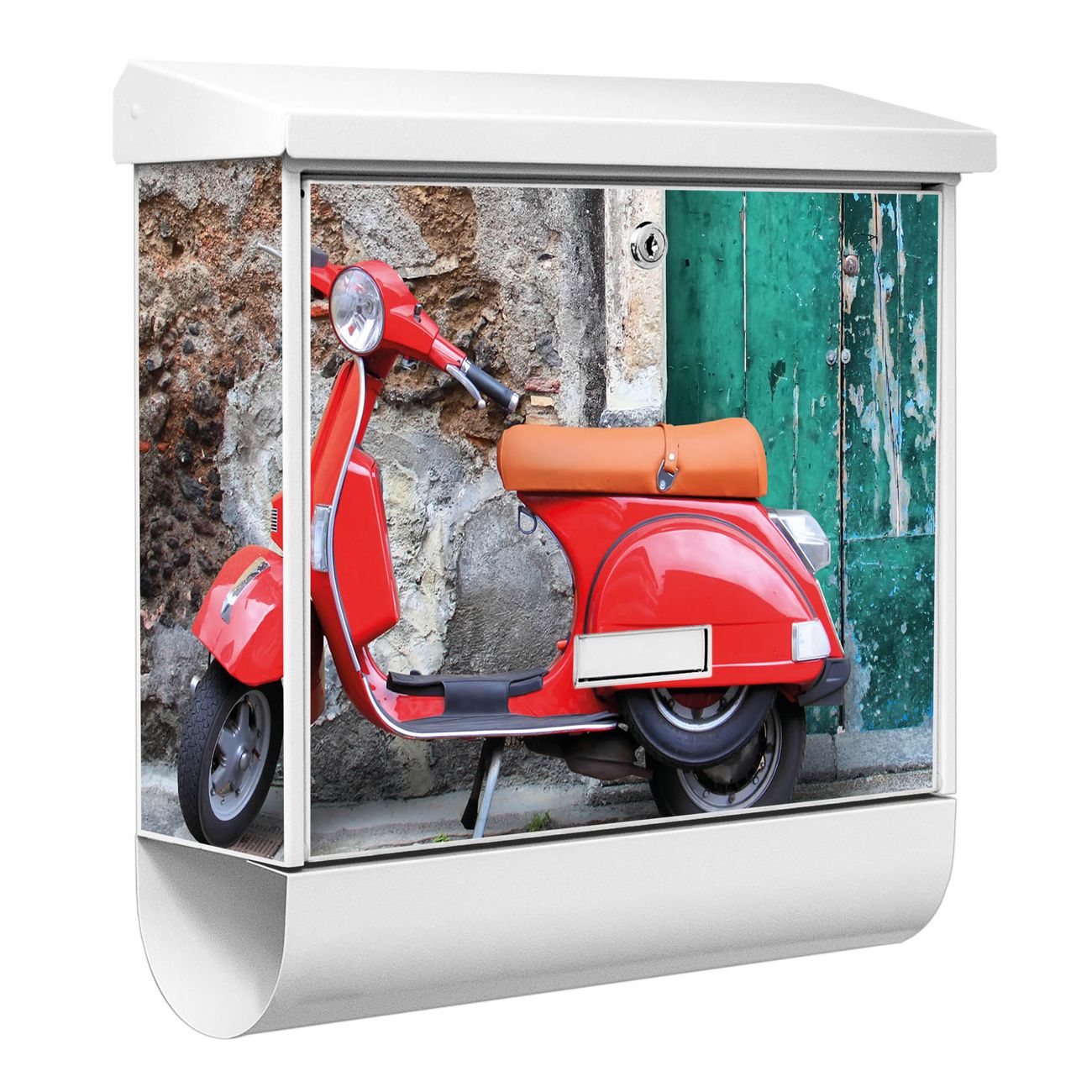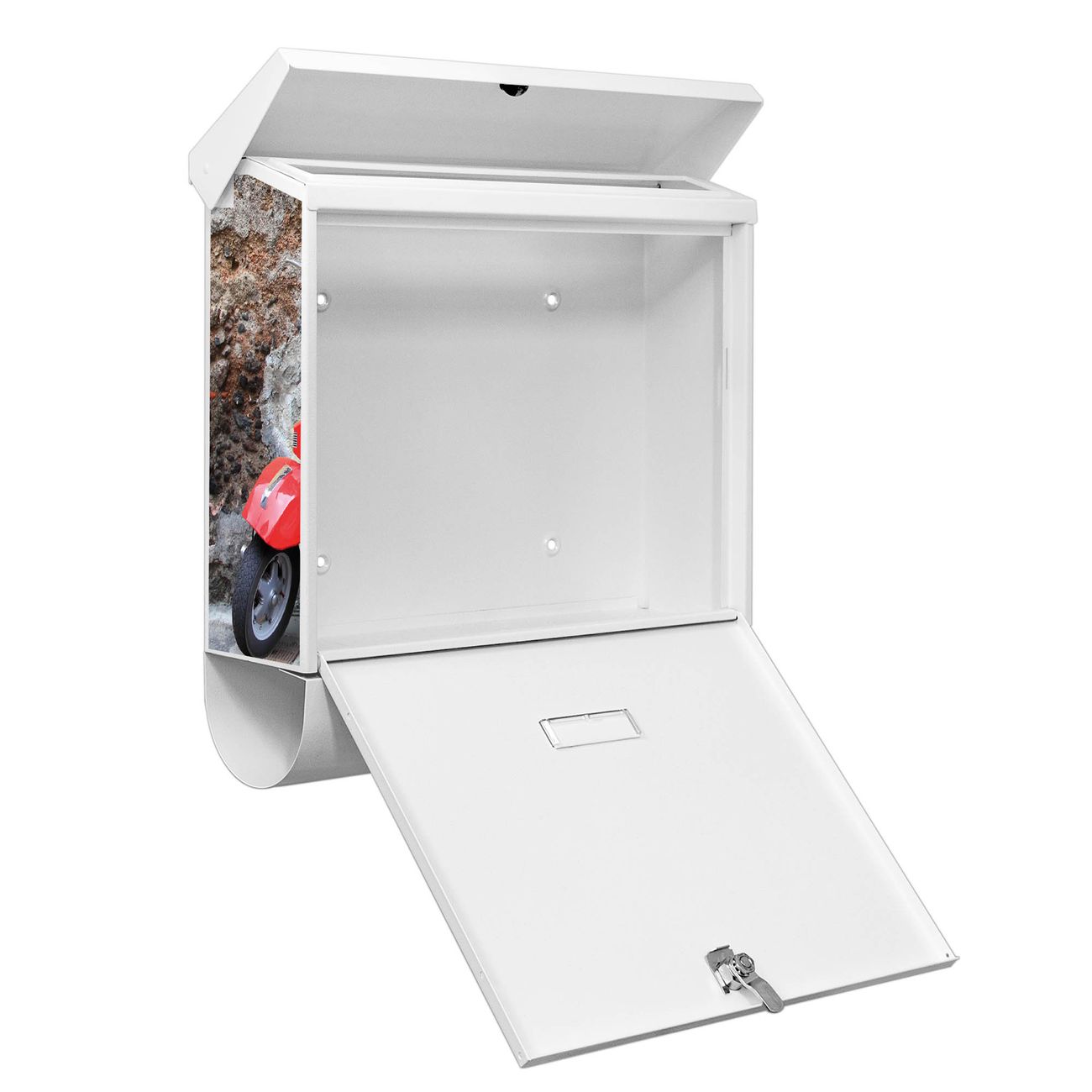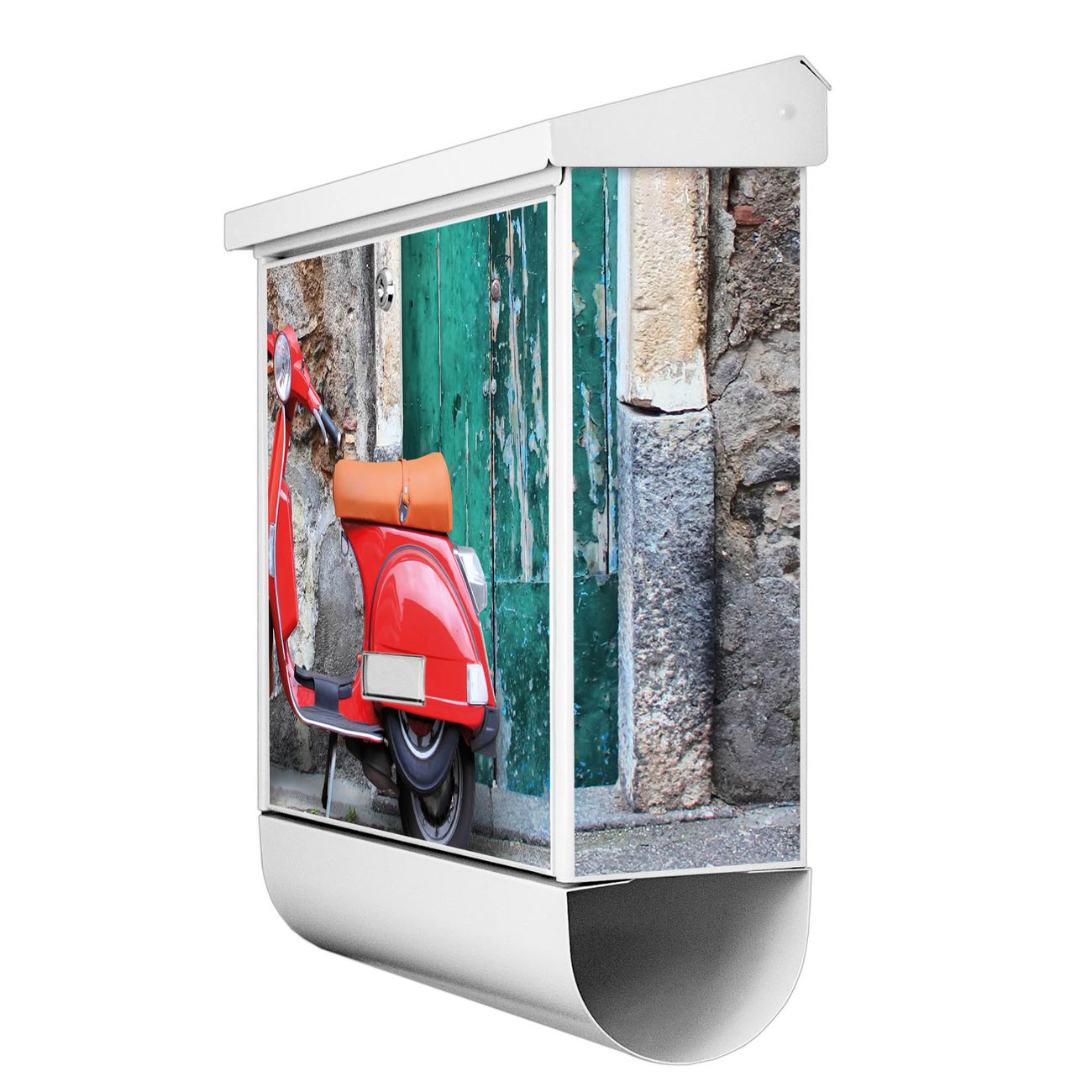 Der BURG-WÄCHTER Stahl Briefkasten mit Italienischer Roller Motiv bietet Ihnen mit seinem Fassungsvermögen genügend Platz auch für große A4 Sendungen und Zeitschriften. Das integrierte Regendach schützt Ihre Post vor dem Eindringen von Regen.