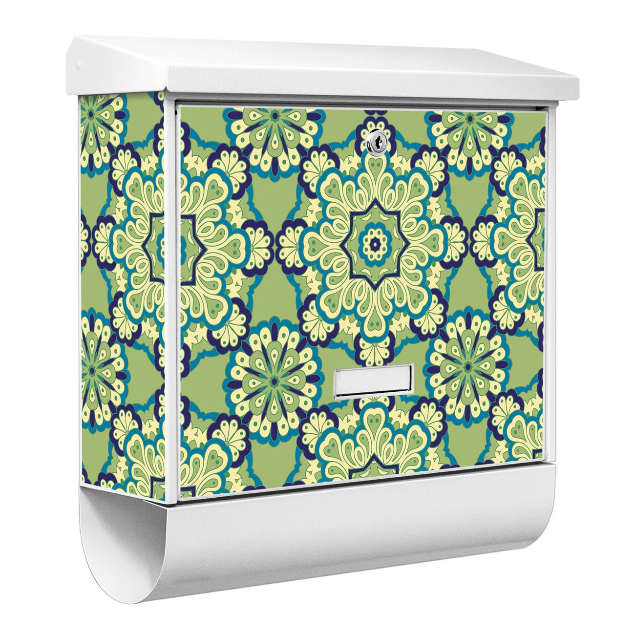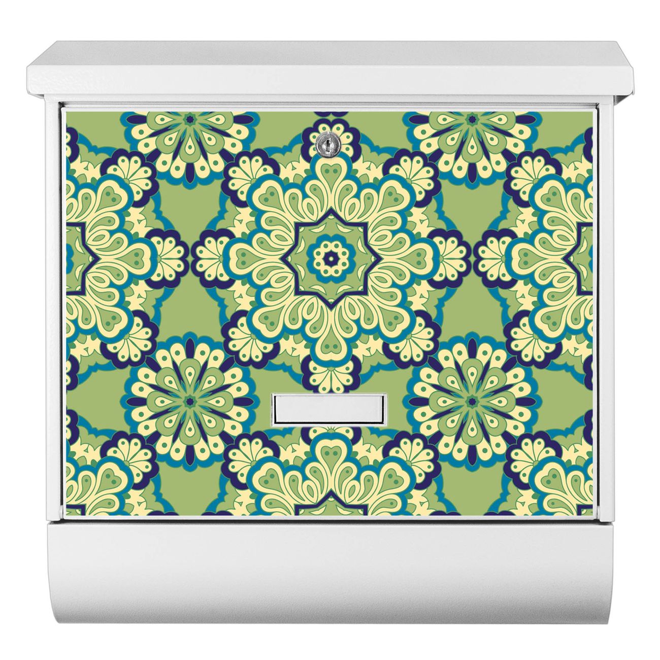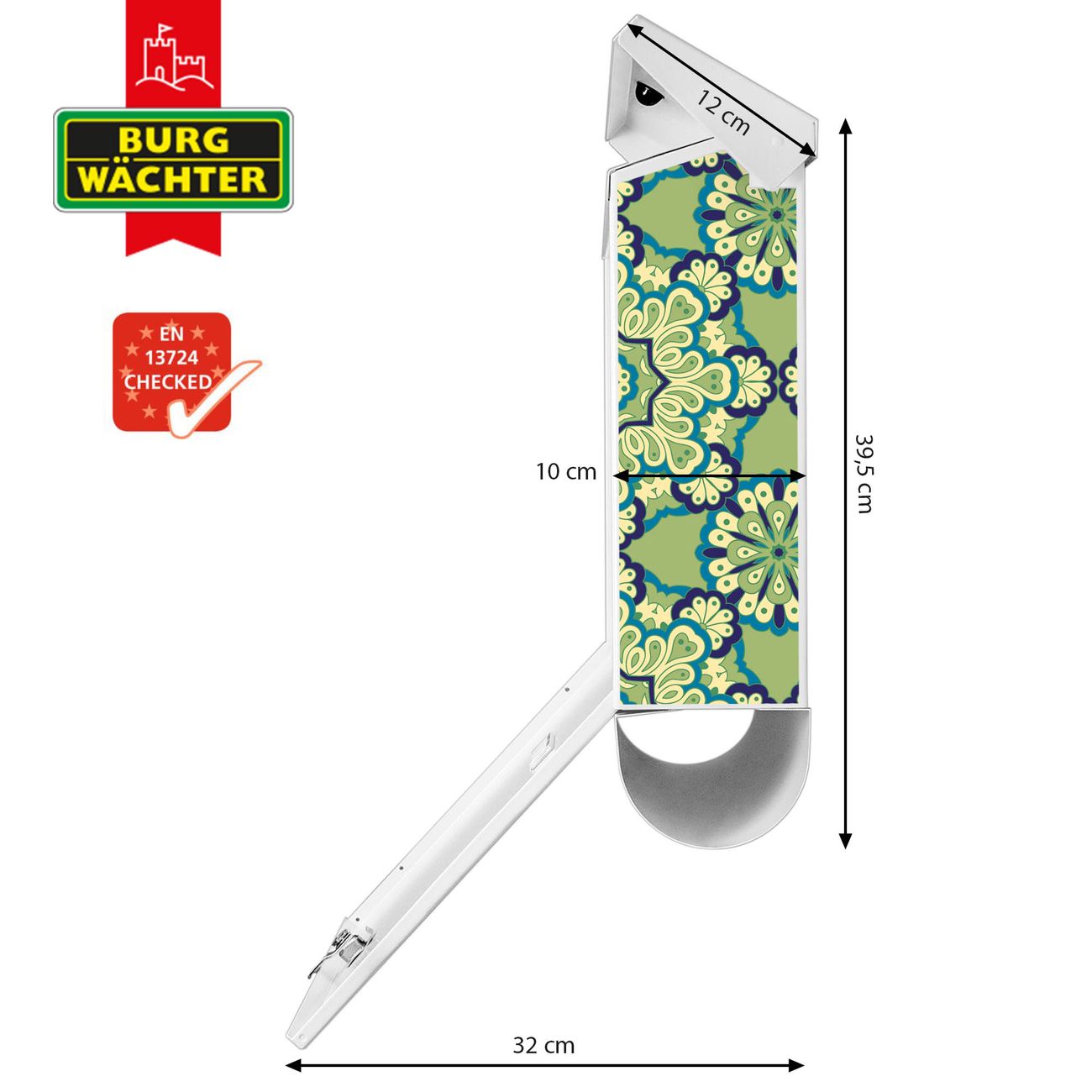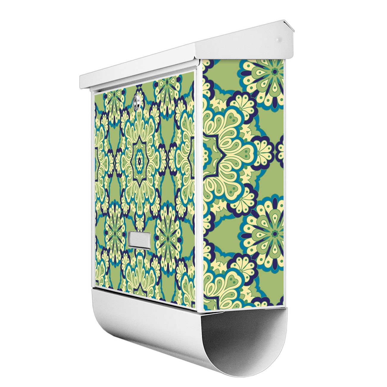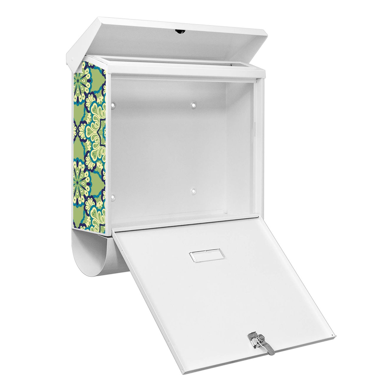 Der BURG-WÄCHTER Stahl Briefkasten mit Kaleidoscop Grün Motiv bietet Ihnen mit seinem Fassungsvermögen genügend Platz auch für große A4 Sendungen und Zeitschriften. Das integrierte Regendach schützt Ihre Post vor dem Eindringen von Regen.