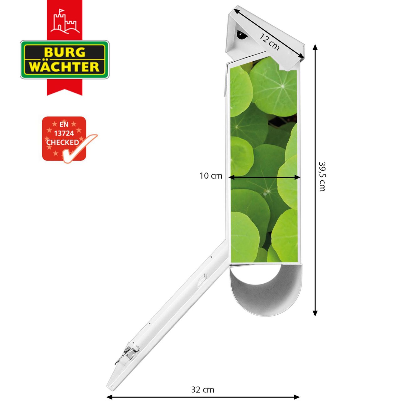 Der BURG-WÄCHTER Stahl Briefkasten mit Kapuzinerkresse Motiv bietet Ihnen mit seinem Fassungsvermögen genügend Platz auch für große A4 Sendungen und Zeitschriften. Das integrierte Regendach schützt Ihre Post vor dem Eindringen von Regen.