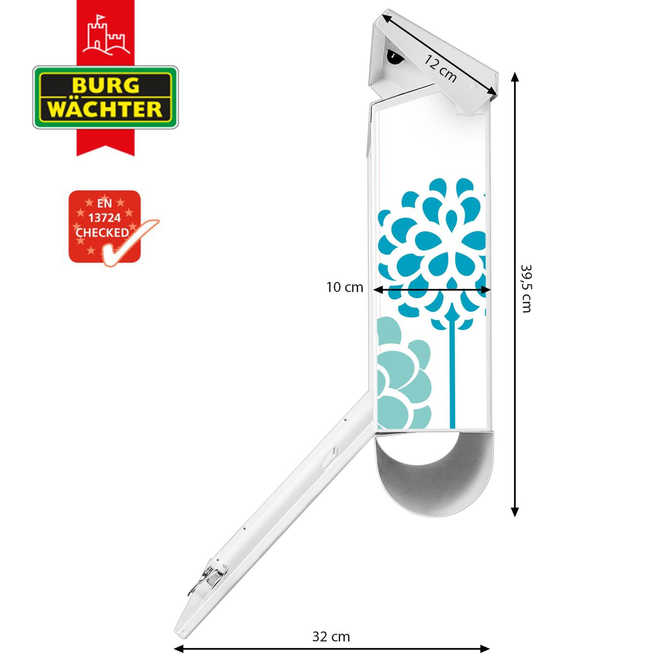 Der BURG-WÄCHTER Stahl Briefkasten mit Kräuterwiese Motiv bietet Ihnen mit seinem Fassungsvermögen genügend Platz auch für große A4 Sendungen und Zeitschriften. Das integrierte Regendach schützt Ihre Post vor dem Eindringen von Regen.