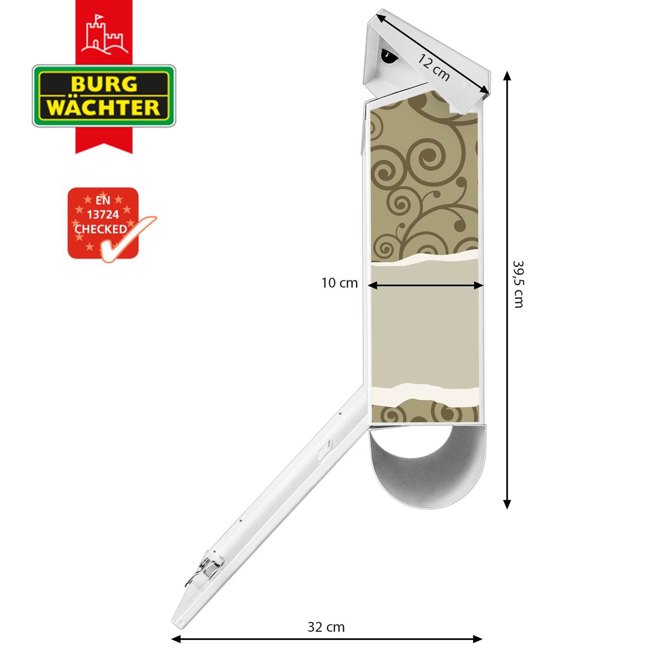 Der BURG-WÄCHTER Stahl Briefkasten mit Kringel Motiv bietet Ihnen mit seinem Fassungsvermögen genügend Platz auch für große A4 Sendungen und Zeitschriften. Das integrierte Regendach schützt Ihre Post vor dem Eindringen von Regen.