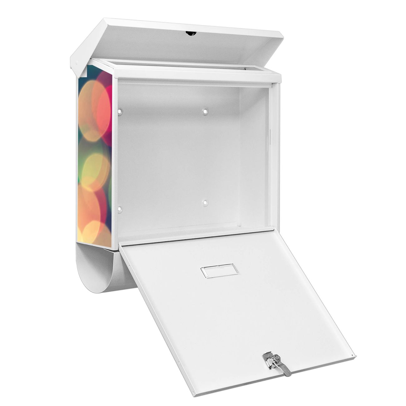 Der BURG-WÄCHTER Stahl Briefkasten mit Lichtpunkte Weiß Grün Rot Motiv bietet Ihnen mit seinem Fassungsvermögen genügend Platz auch für große A4 Sendungen und Zeitschriften. Das integrierte Regendach schützt Ihre Post vor dem Eindringen von Regen.