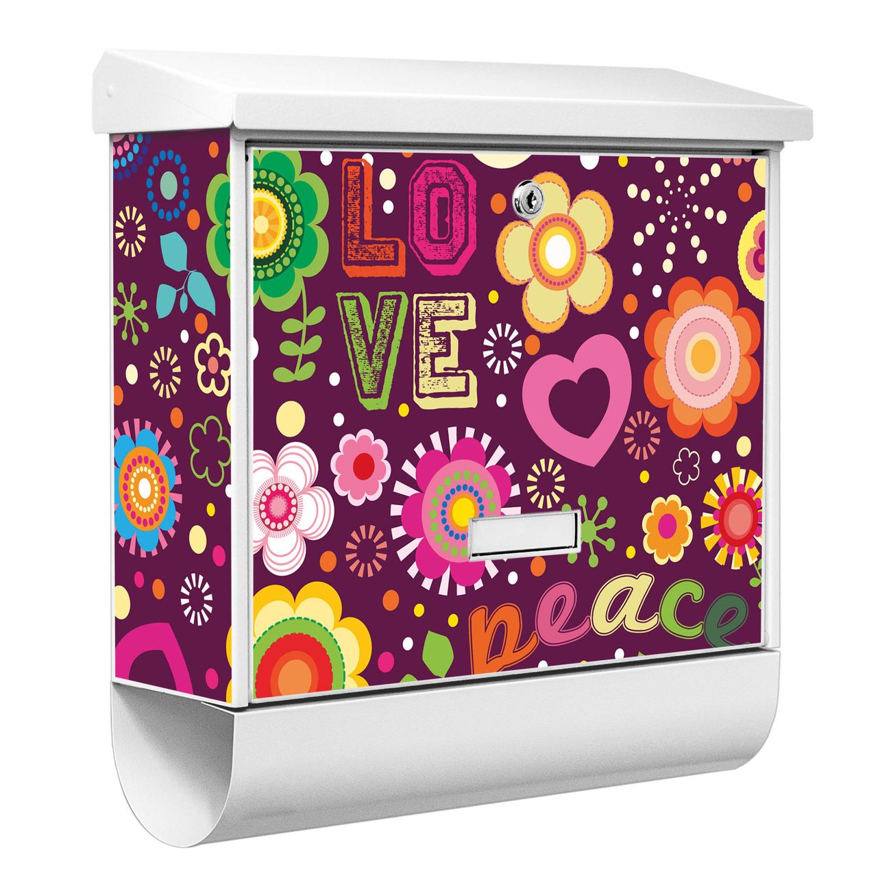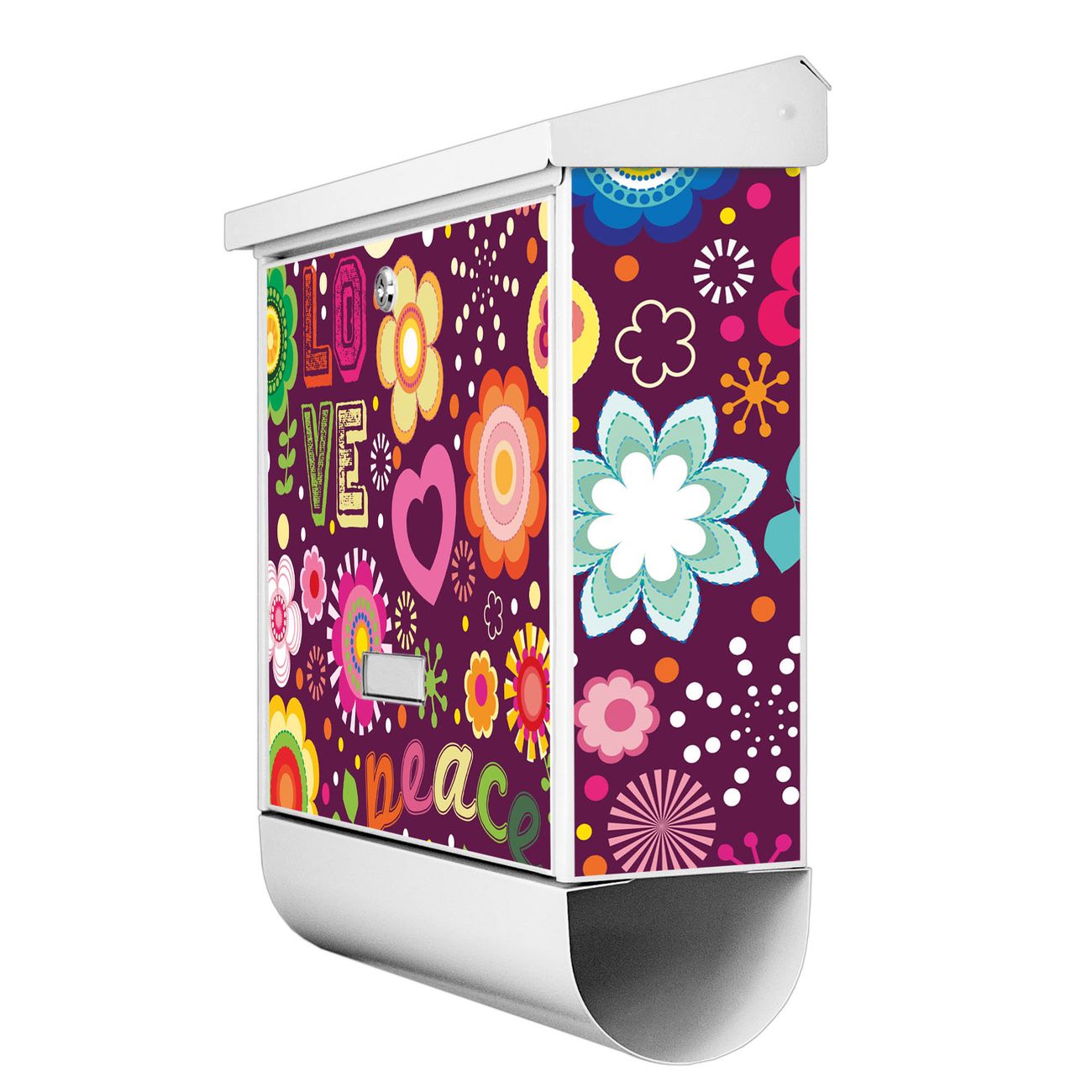 Der BURG-WÄCHTER Stahl Briefkasten mit Love and Peace Motiv bietet Ihnen mit seinem Fassungsvermögen genügend Platz auch für große A4 Sendungen und Zeitschriften. Das integrierte Regendach schützt Ihre Post vor dem Eindringen von Regen.