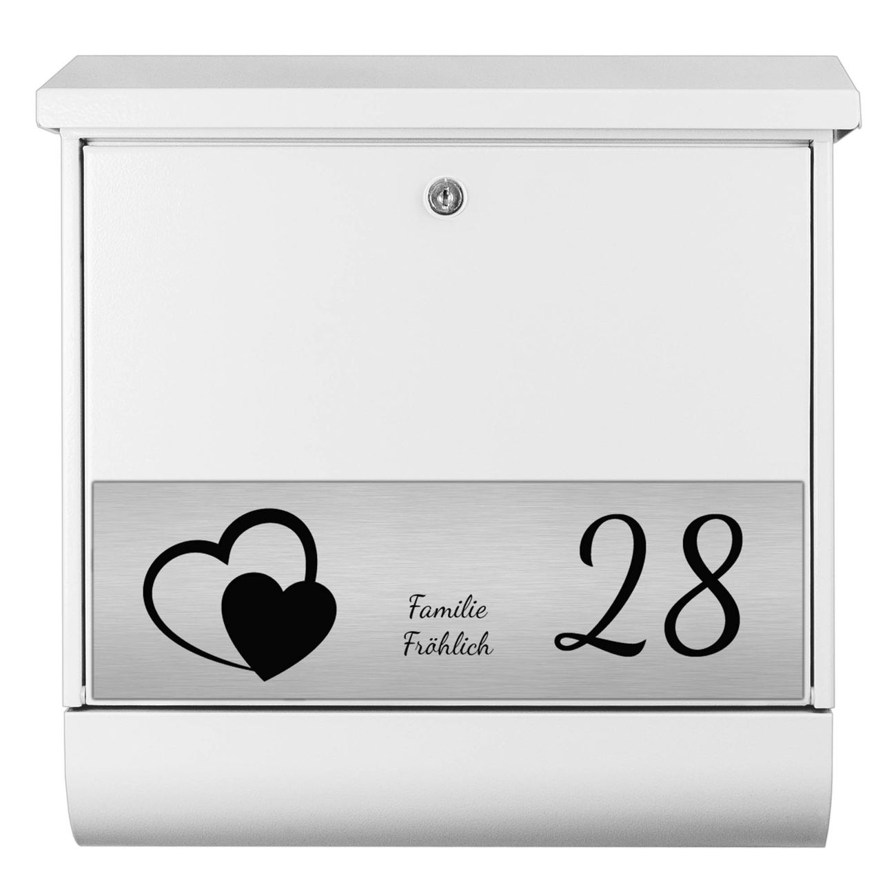 Der Briefkasten besteht aus Stahl, einem hochwertigen Material das äußerst unempfindlich gegenüber Witterungseinflüssen ist. Die Gravur Platte aus Acryl in Metall-Optik ist 33x10cm groß und schmückt die Vorderseite des Briefkastens. Das Material sieht Metall zum Verwechseln ähnlich und ist ebenso witterungsbeständig wie dieser. Durch das Bearbeiten erscheint an den gravierten Stellen die schwarze Unterschicht und hebt so in einem guten Kontrast ihren Wunschtext, Ihre Hausnummer und die Gravur immer ab. Der Postkasten ist 42,5cm hoch, 38cm breit und 11,5cm tief. Der Briefeinwurf ist 33,2cm x 3,1cm, Format DIN C4. Der Briefkasten wird mit Montagematerial und zwei Schlüsseln geliefert.