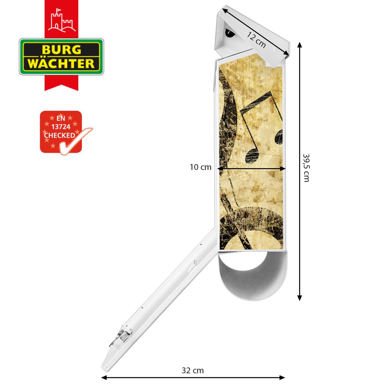 Der BURG-WÄCHTER Stahl Briefkasten mit Music Motiv bietet Ihnen mit seinem Fassungsvermögen genügend Platz auch für große A4 Sendungen und Zeitschriften. Das integrierte Regendach schützt Ihre Post vor dem Eindringen von Regen.