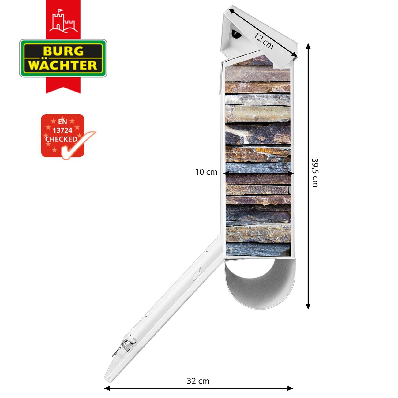 Der BURG-WÄCHTER Stahl Briefkasten mit Naturstein Motiv bietet Ihnen mit seinem Fassungsvermögen genügend Platz auch für große A4 Sendungen und Zeitschriften. Das integrierte Regendach schützt Ihre Post vor dem Eindringen von Regen.