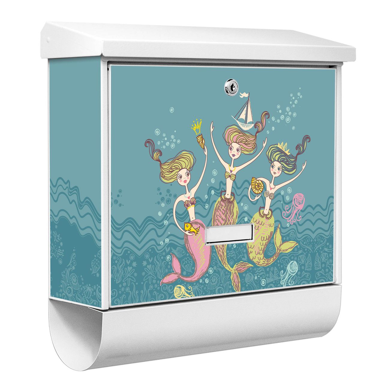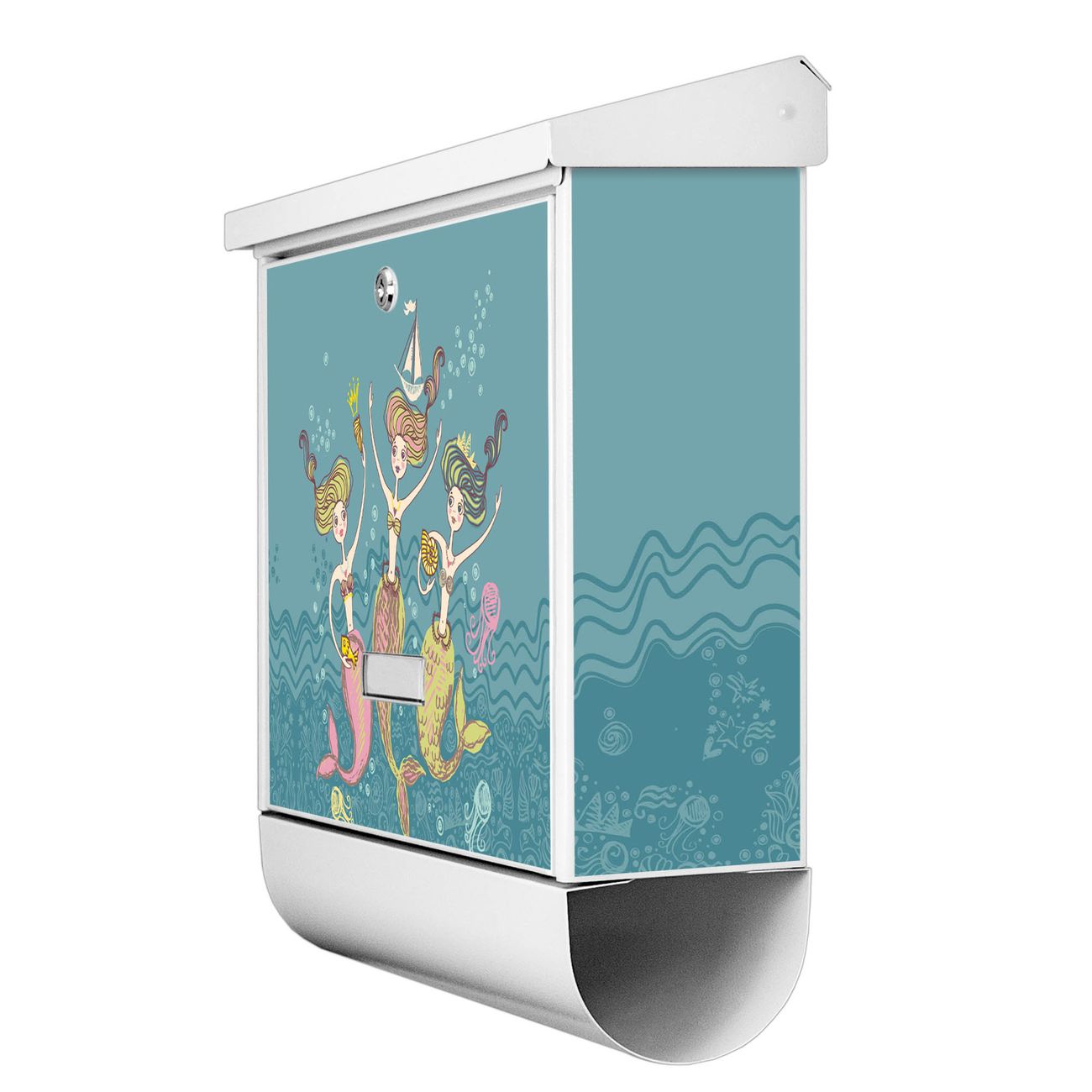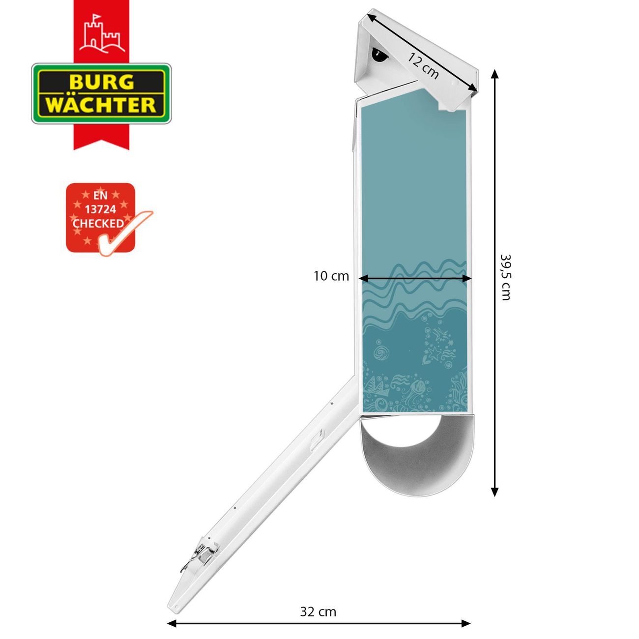 Der BURG-WÄCHTER Stahl Briefkasten mit Nixen Motiv bietet Ihnen mit seinem Fassungsvermögen genügend Platz auch für große A4 Sendungen und Zeitschriften. Das integrierte Regendach schützt Ihre Post vor dem Eindringen von Regen.