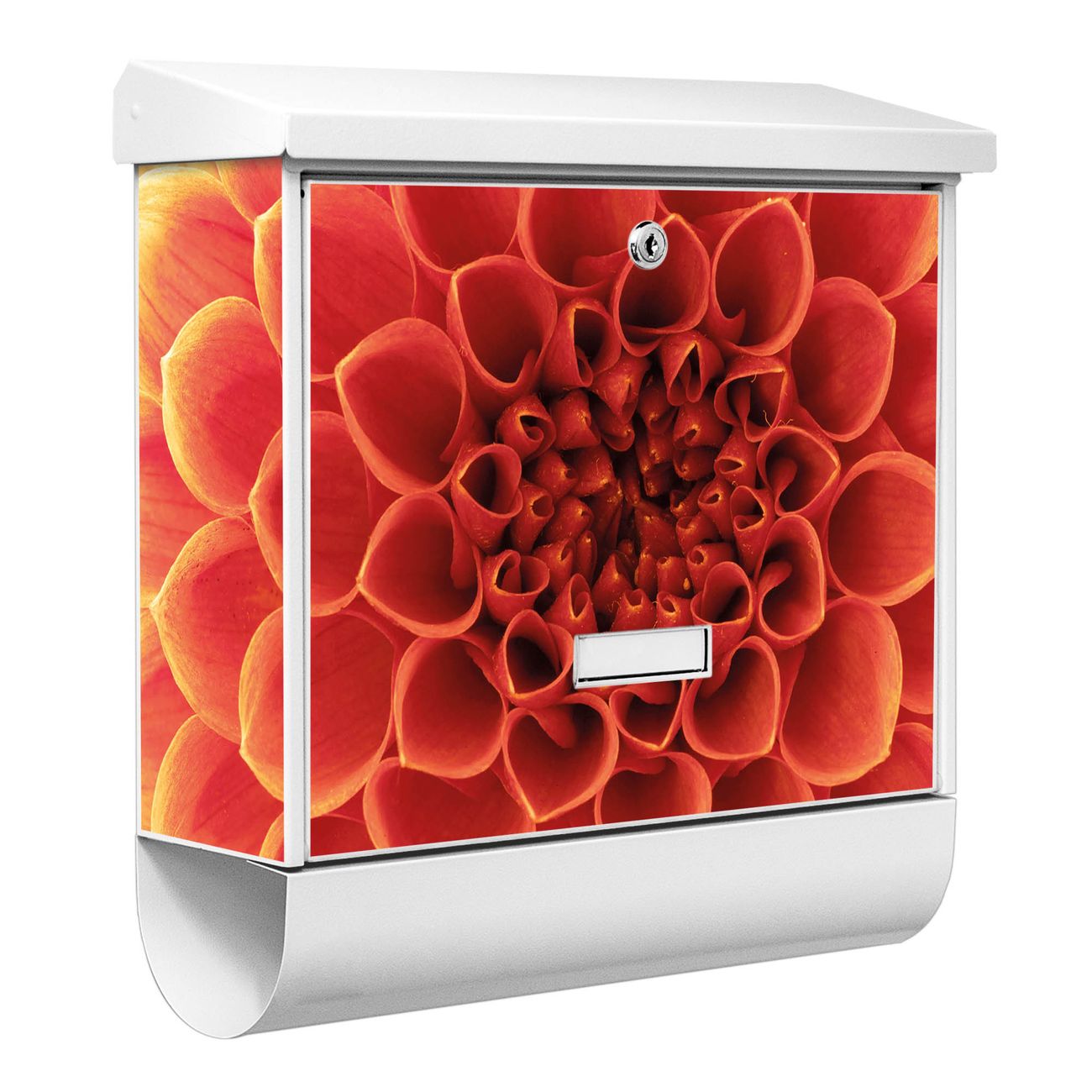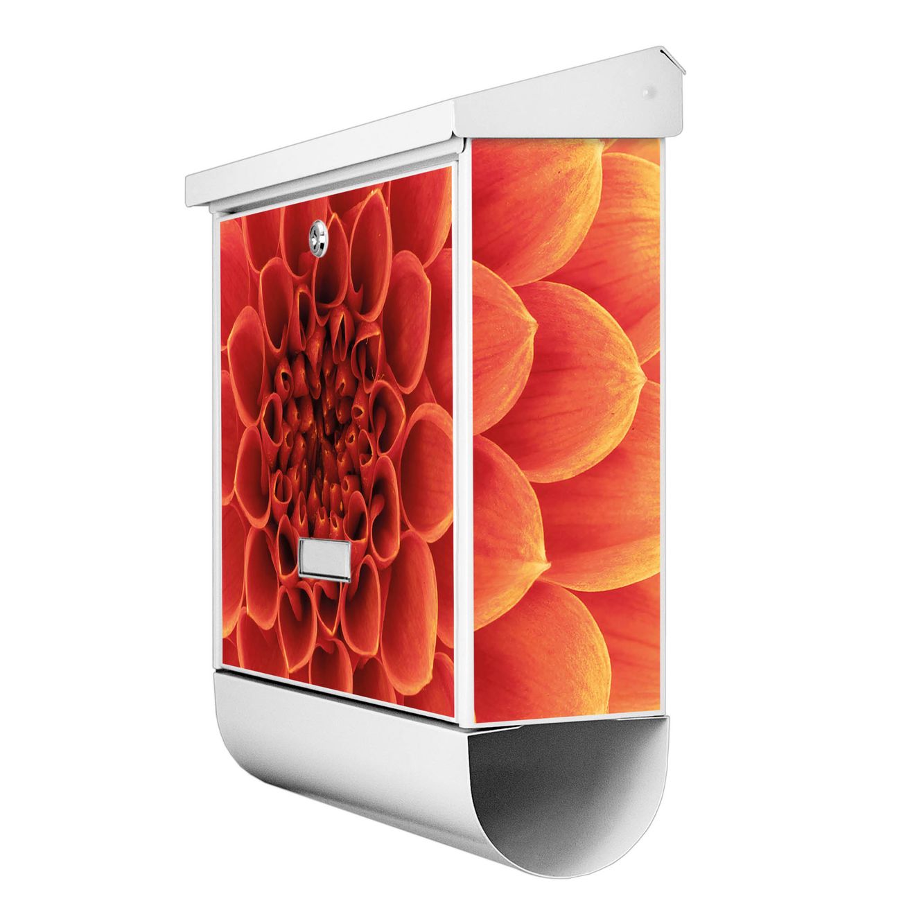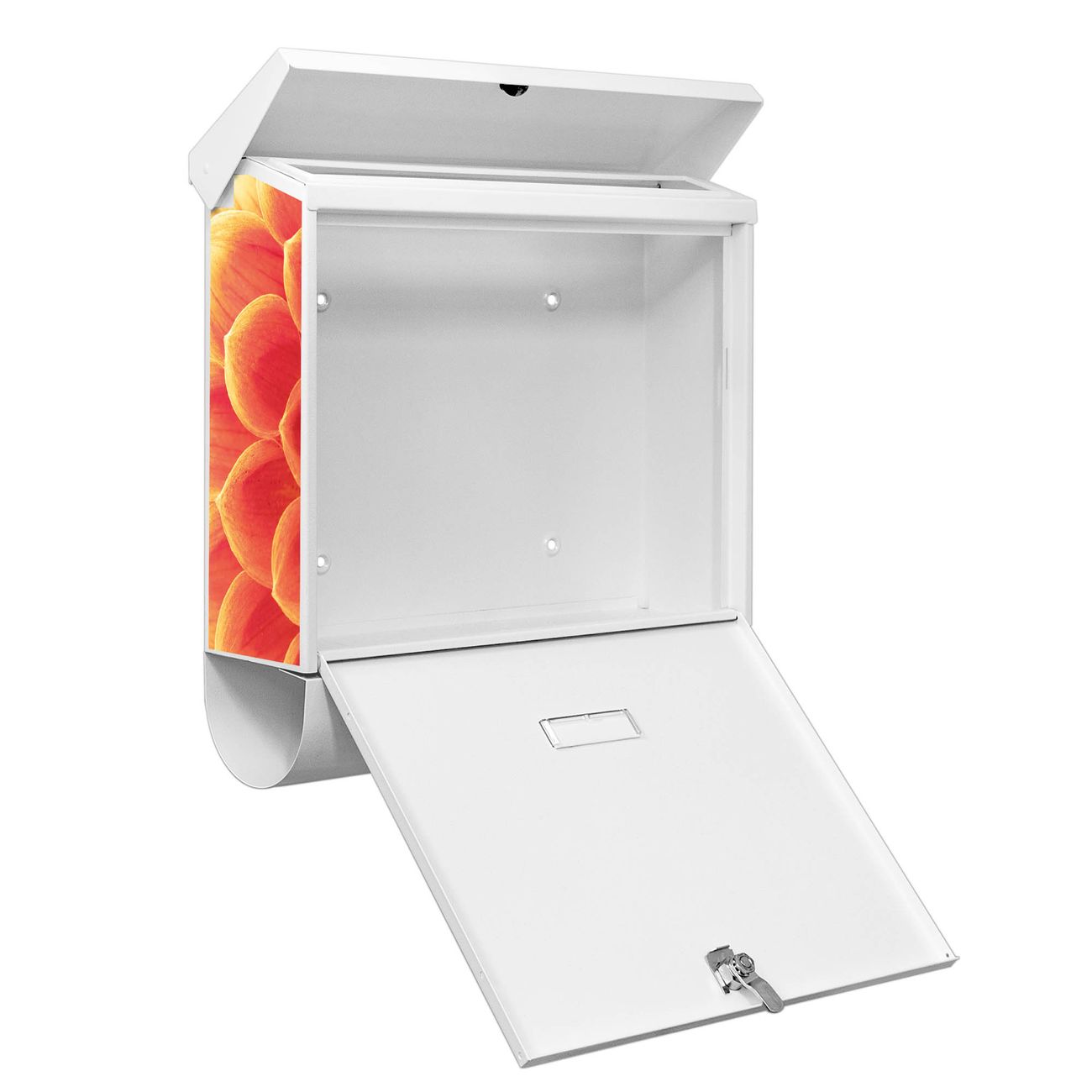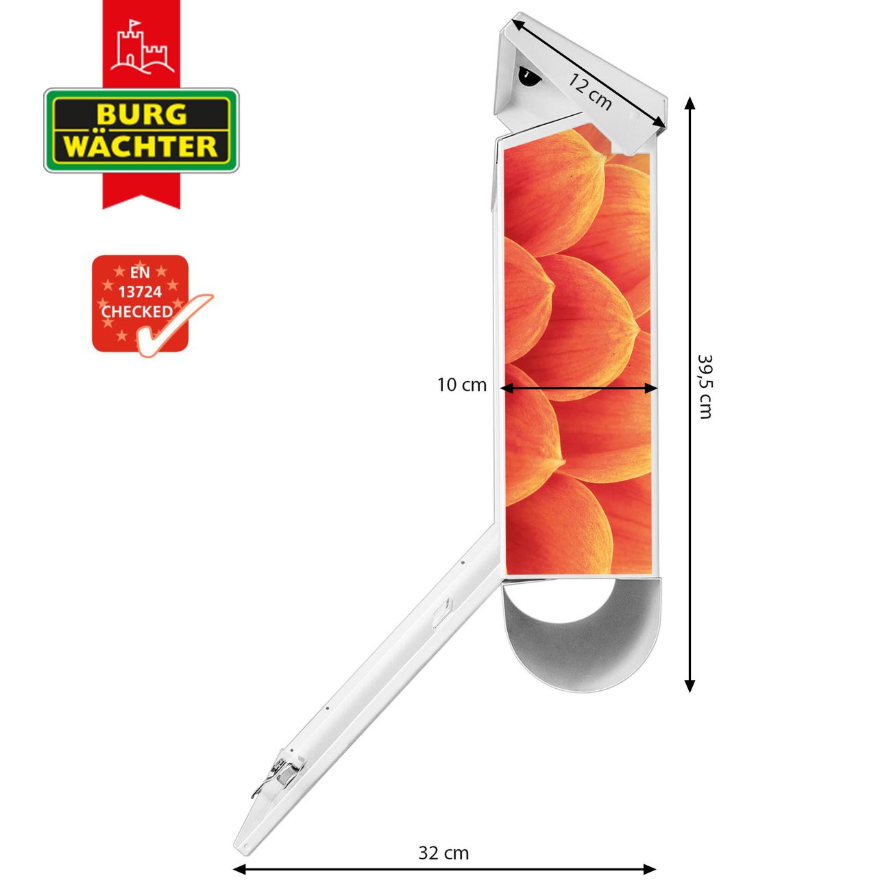 Der BURG-WÄCHTER Stahl Briefkasten mit Orange Chrysantheme Motiv bietet Ihnen mit seinem Fassungsvermögen genügend Platz auch für große A4 Sendungen und Zeitschriften. Das integrierte Regendach schützt Ihre Post vor dem Eindringen von Regen.