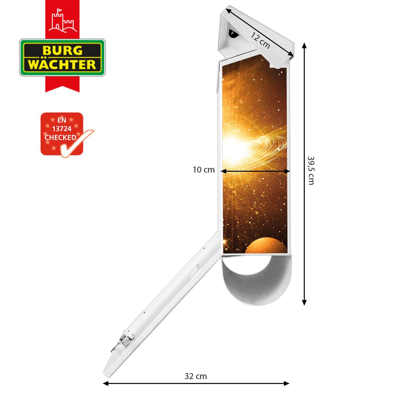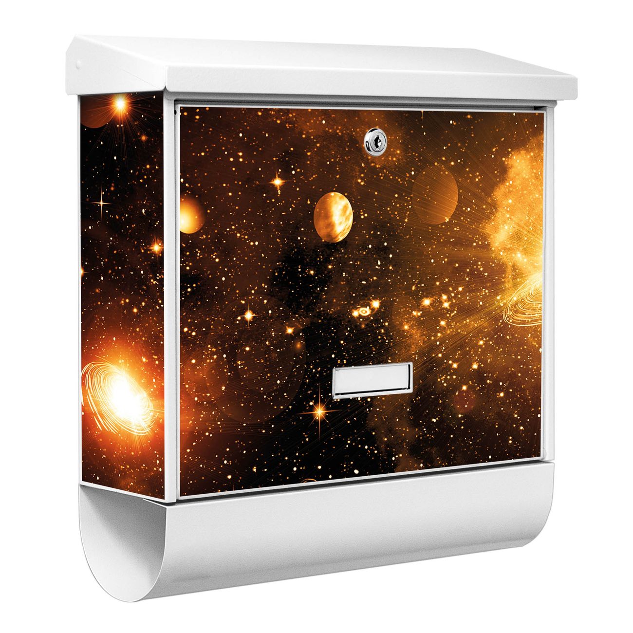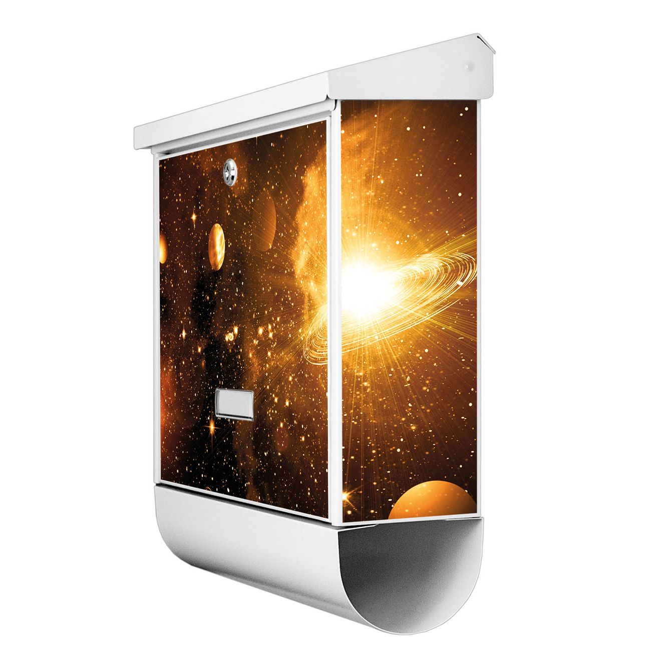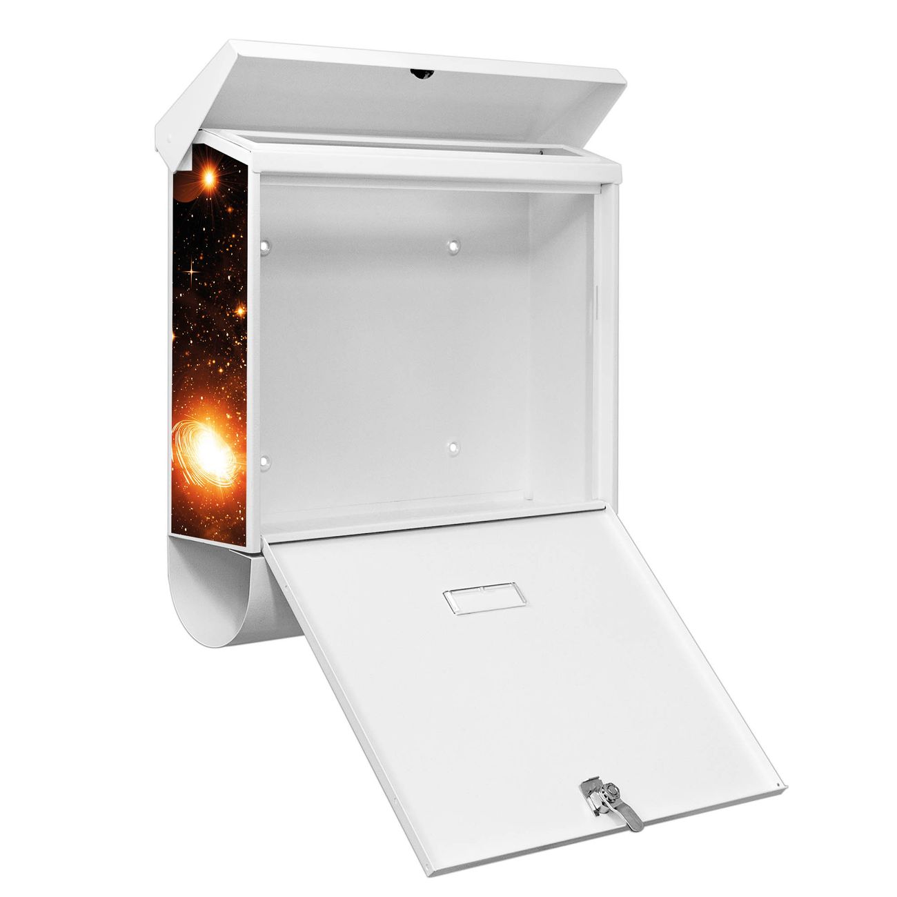 Der BURG-WÄCHTER Stahl Briefkasten mit Outer Space Motiv bietet Ihnen mit seinem Fassungsvermögen genügend Platz auch für große A4 Sendungen und Zeitschriften. Das integrierte Regendach schützt Ihre Post vor dem Eindringen von Regen.