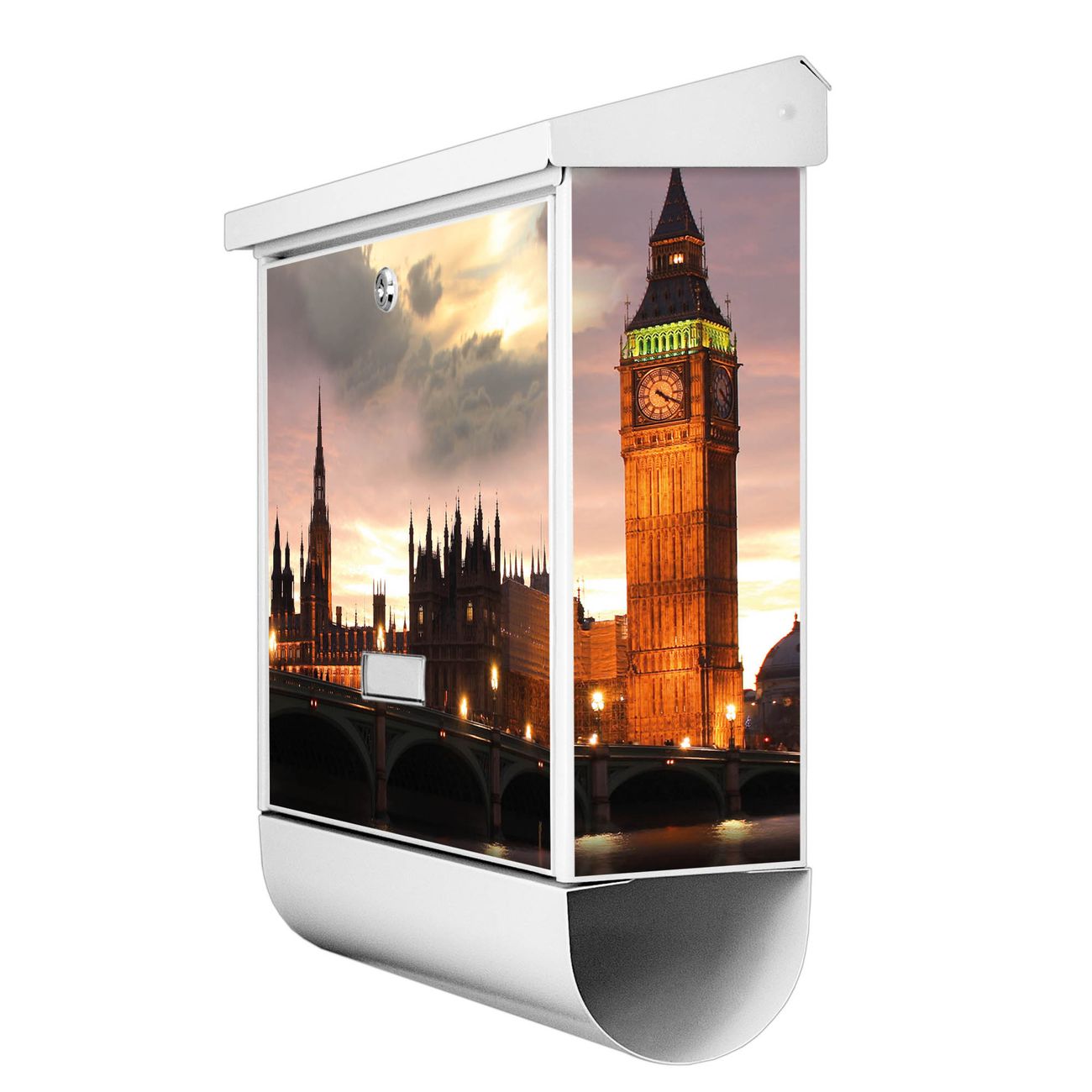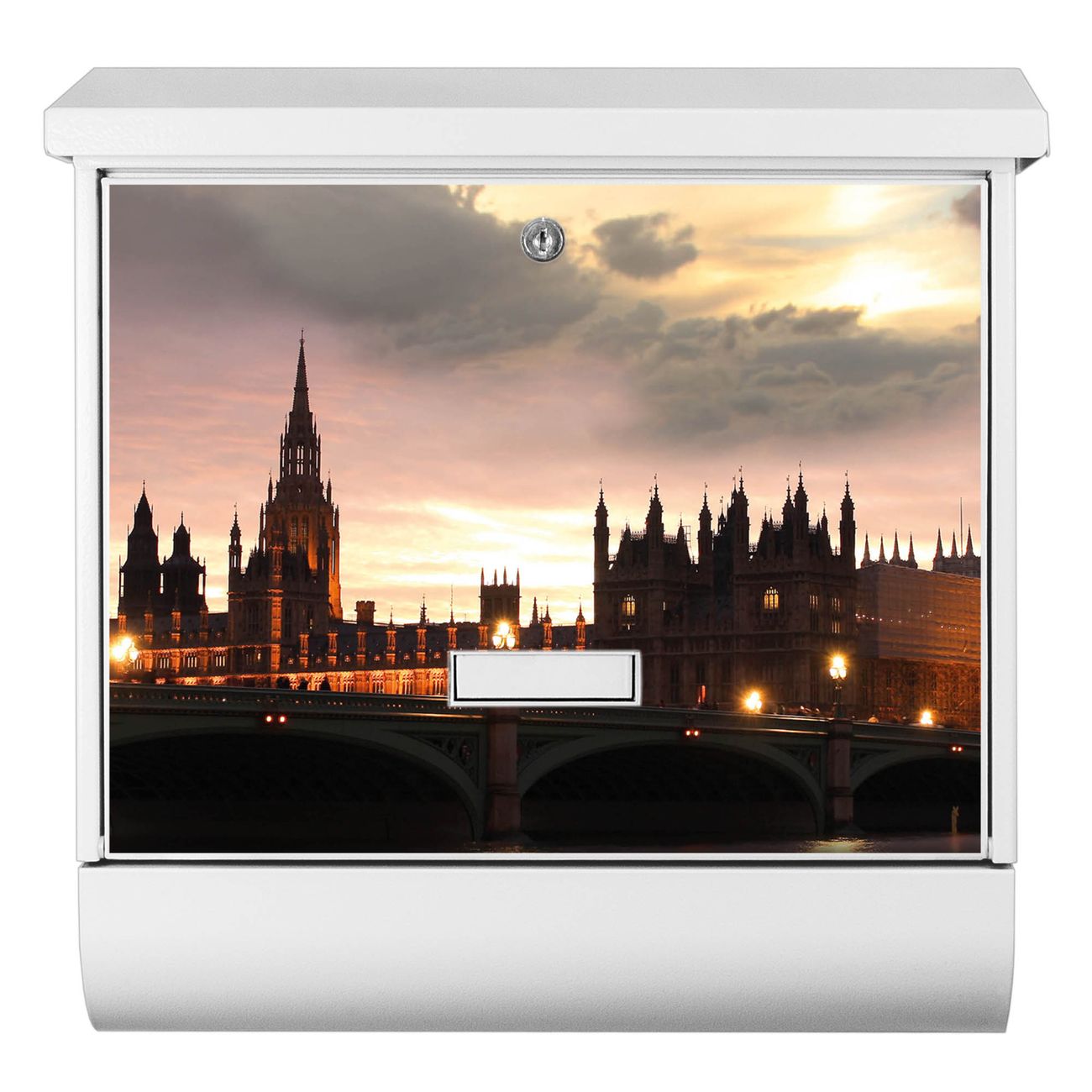 Der BURG-WÄCHTER Stahl Briefkasten mit Palace of Westminster Motiv bietet Ihnen mit seinem Fassungsvermögen genügend Platz auch für große A4 Sendungen und Zeitschriften. Das integrierte Regendach schützt Ihre Post vor dem Eindringen von Regen.