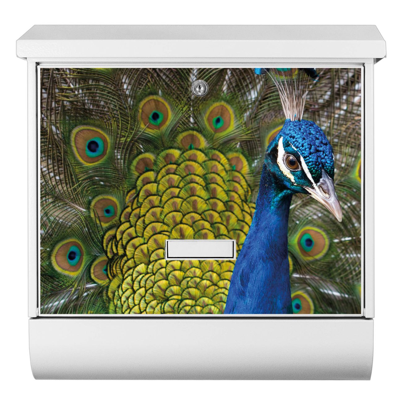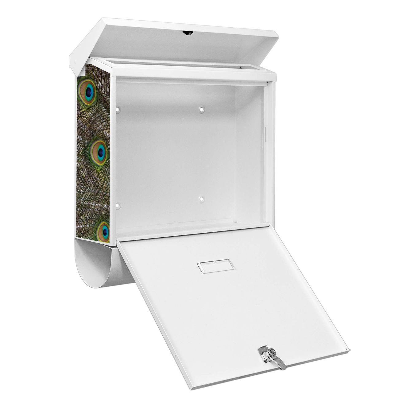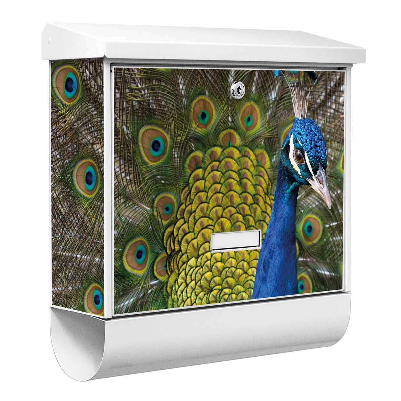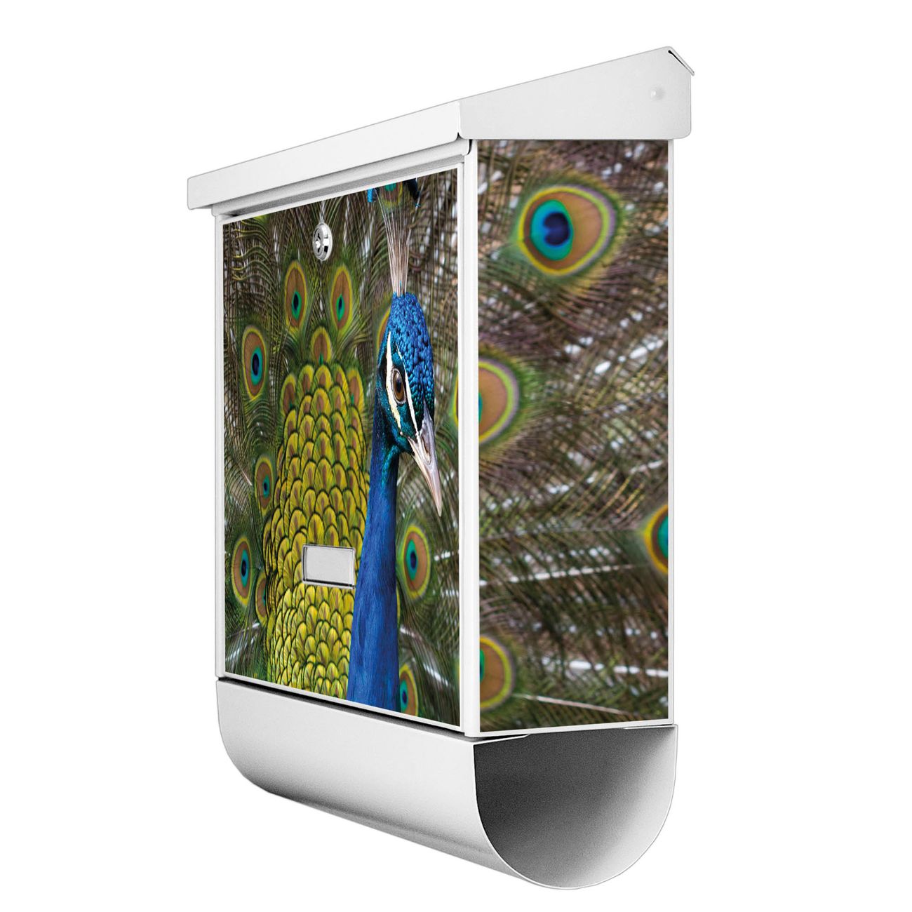 Der BURG-WÄCHTER Stahl Briefkasten mit Pfau Motiv bietet Ihnen mit seinem Fassungsvermögen genügend Platz auch für große A4 Sendungen und Zeitschriften. Das integrierte Regendach schützt Ihre Post vor dem Eindringen von Regen.